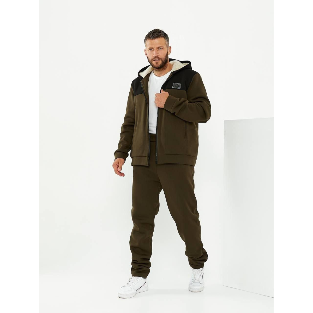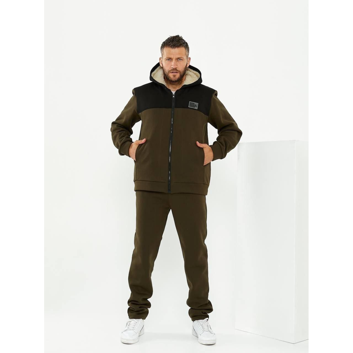 Кофта із капюшоном та на молнії. Штани прямого крою, трошки завужені до низу, з двома кишенями та широкою резинкою на поясі.