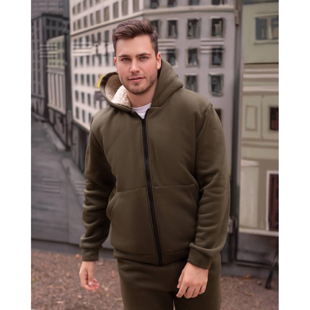 Кофта із капюшоном та на молнії. Штани прямого крою, трошки завужені до низу, з двома кишенями та широкою резинкою на поясі.