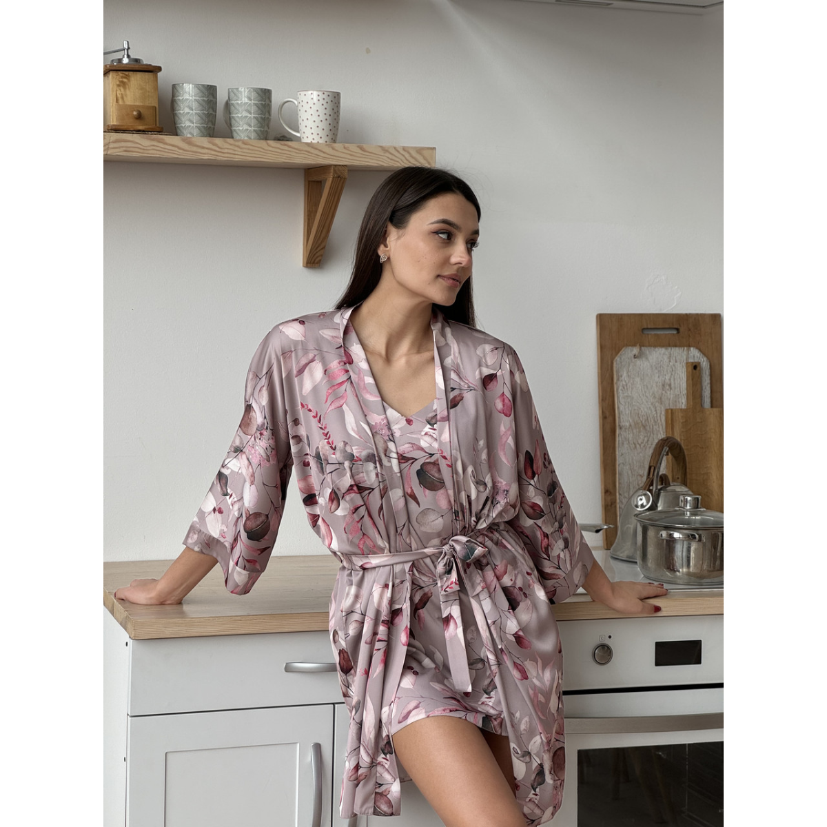 Наш халат виготовлений із шовку Армані - це матеріал преміальної якості, який не тільки красиво струмує, а й підкреслює фігуру, створюючи витончений силует. Легкий благородний блиск надає образу особливого шарму, а стильний принт робить його ще більш виразним.