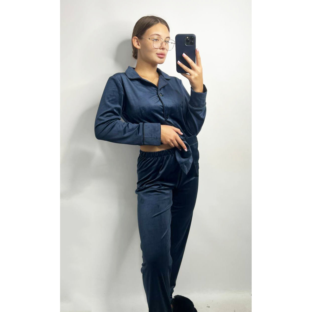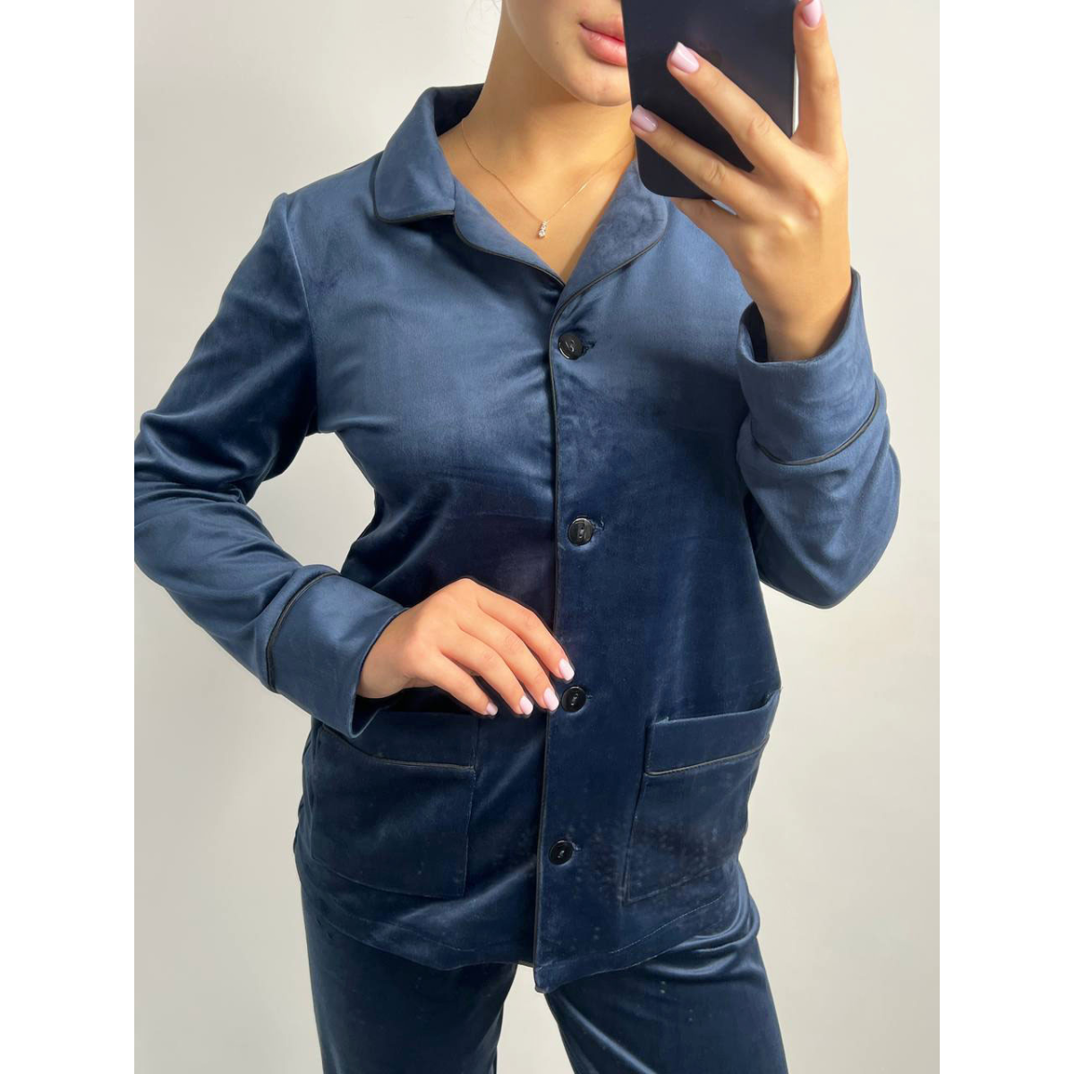 Костюм з плюшевого велюру на ґудзиках із двома кишенями. S, Синій