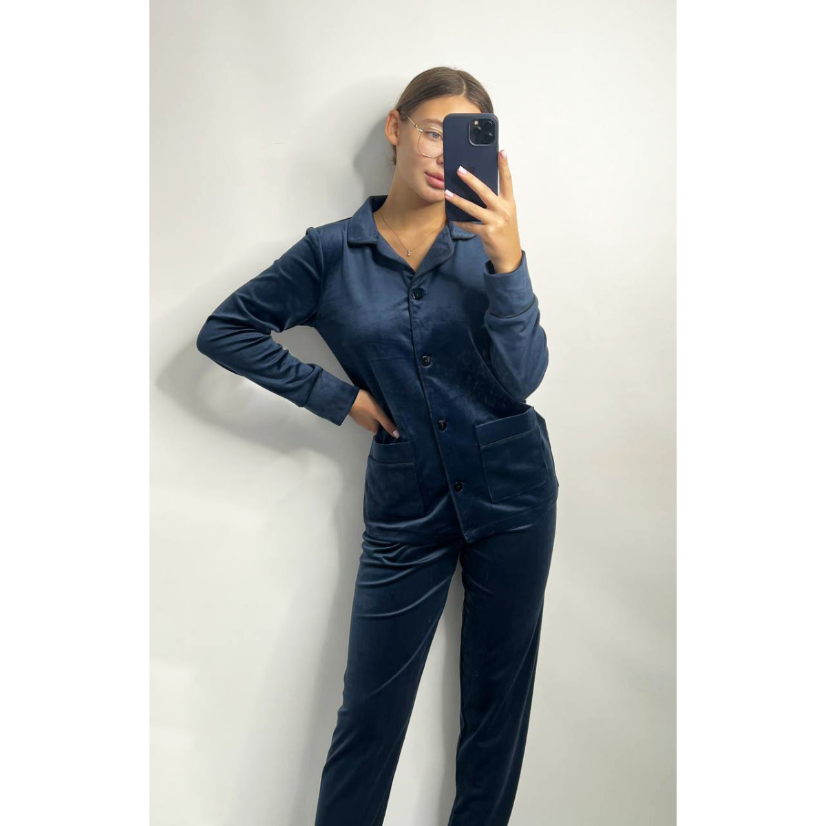 Костюм з плюшевого велюру на ґудзиках із двома кишенями. M, Синій