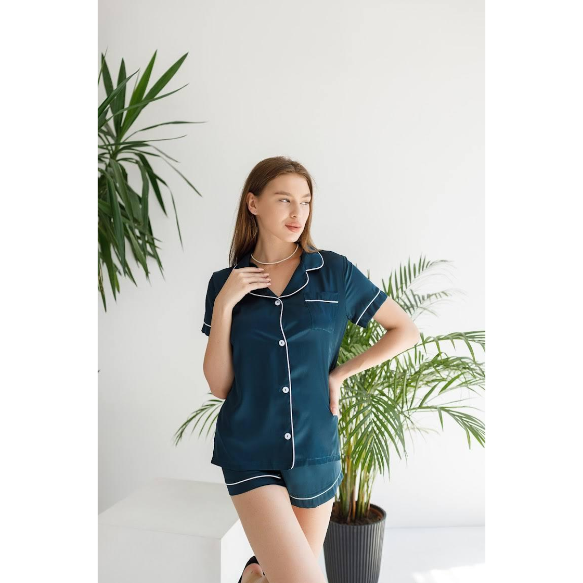 Виберіть комплект із шортів і сорочки на гудзиках із тканини шовк Армані та насолоджуйтесь розкішшю та комфортом щодня.