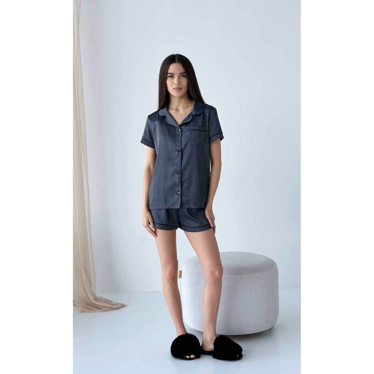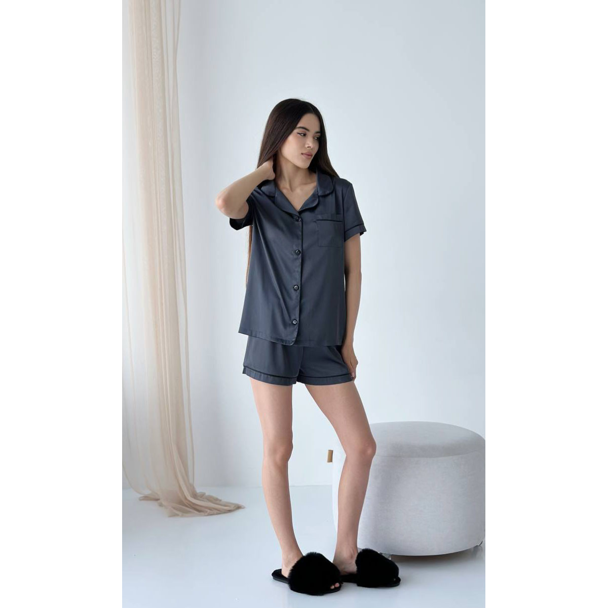 Виберіть комплект із шортів і сорочки на гудзиках із тканини шовк Армані та насолоджуйтесь розкішшю та комфортом щодня.