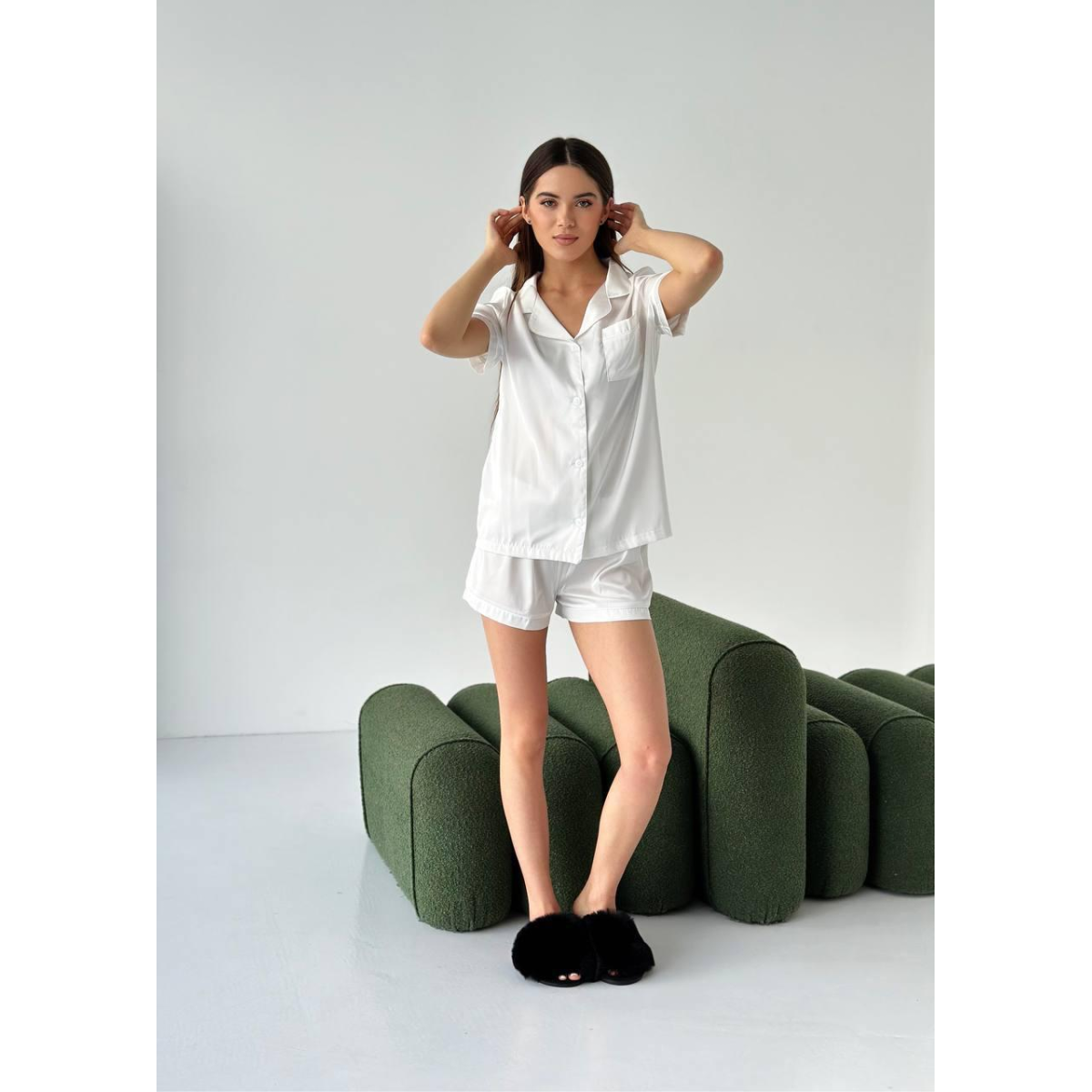 Виберіть комплект із шортів і сорочки на гудзиках із тканини шовк Армані та насолоджуйтесь розкішшю та комфортом щодня.