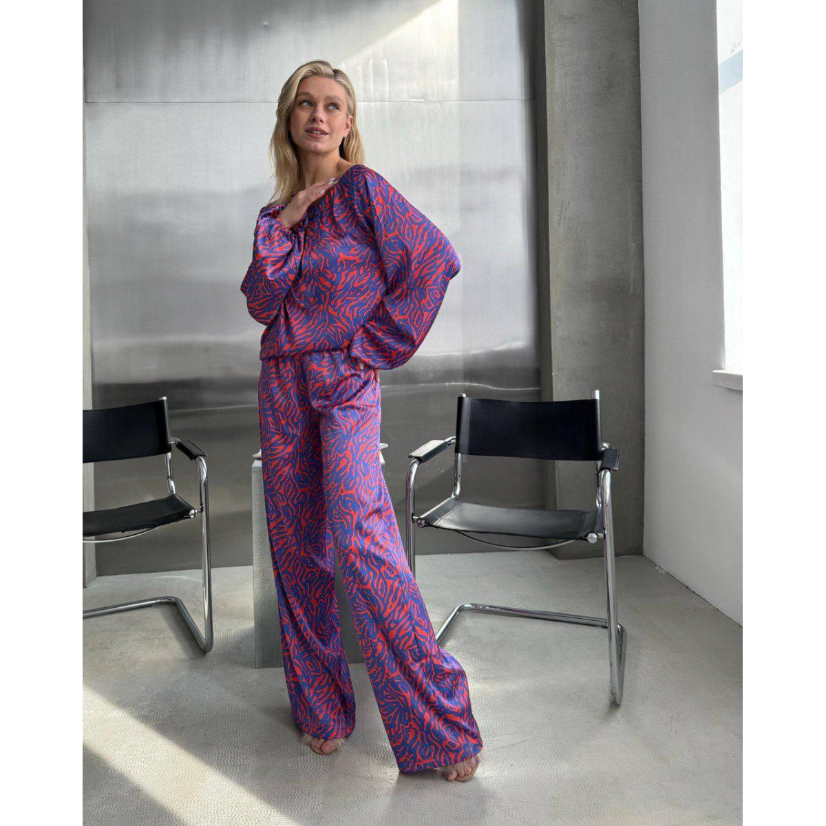 Жіночий костюм із шовку Армані: блуза з довгим рукавом-фонариком та брюки-кльош — елегантність і стиль в одному комплекті