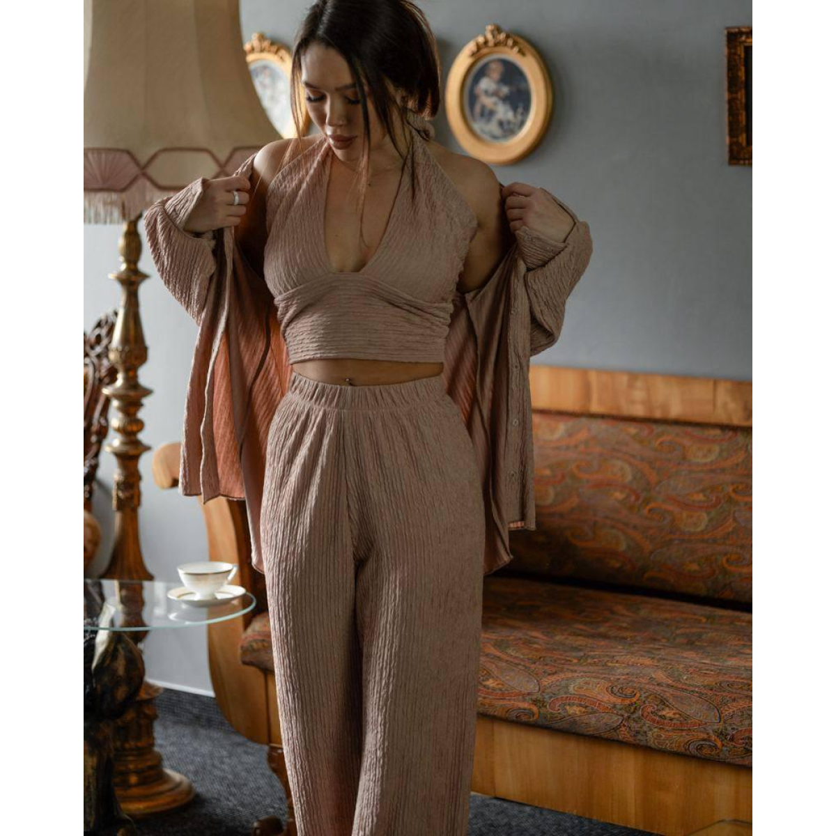 Літній жіночий костюм-трійка з віскози жатки — стиль, комфорт і легкість рухів