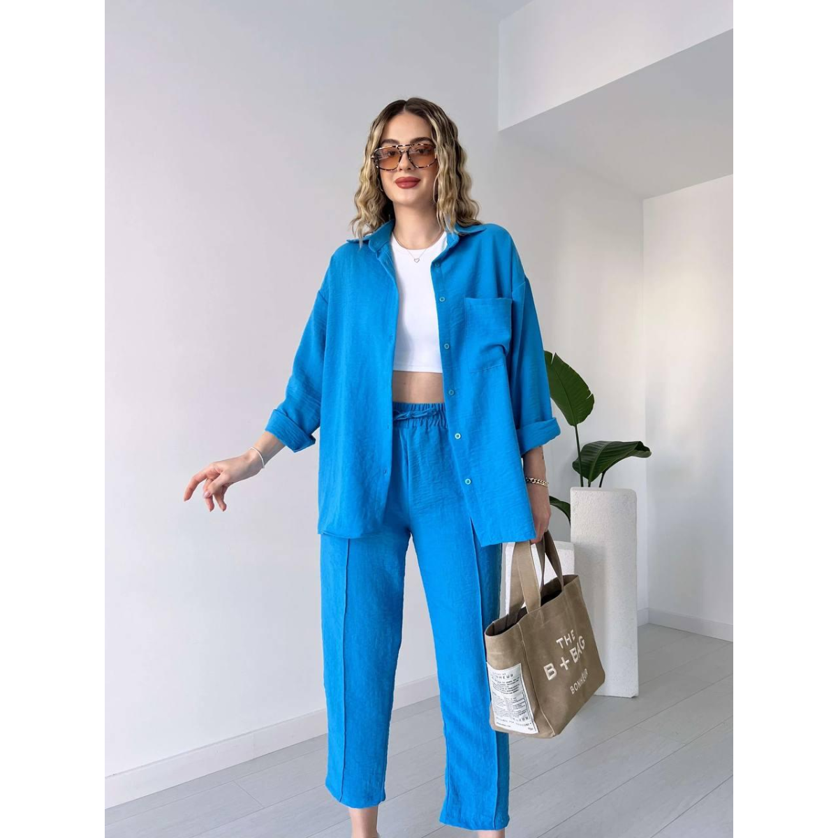 Жіночий літній костюм - чудовий вибір для стильних та комфортних образів у спекотні дні. Він складається з сорочки вільного крою та штанів, створених для легкості та зручності.