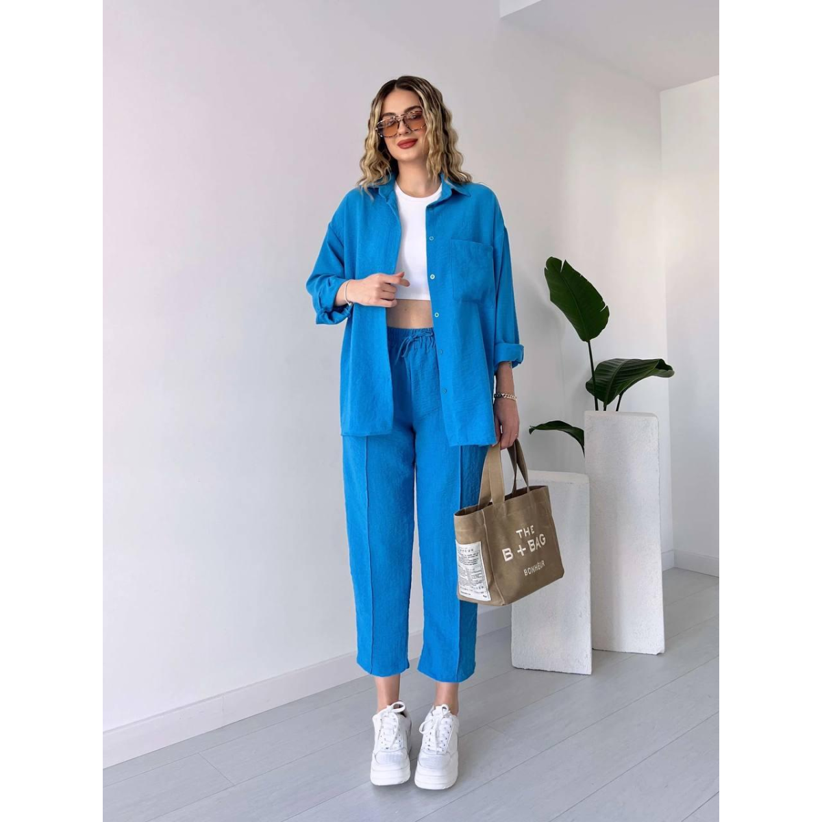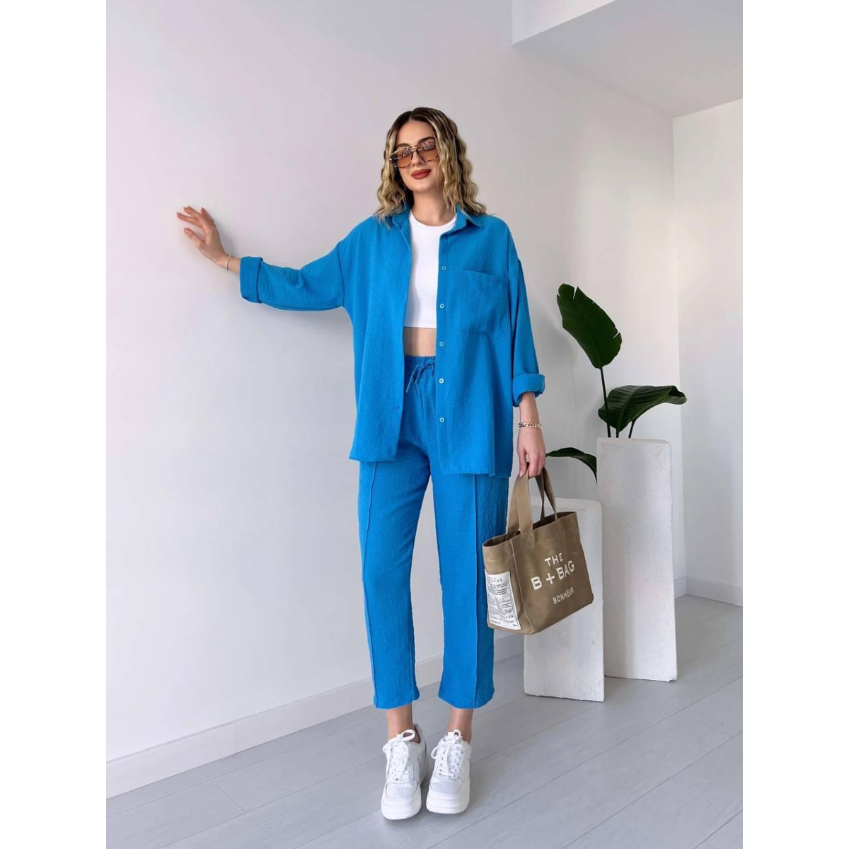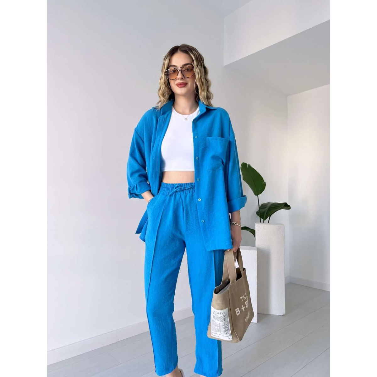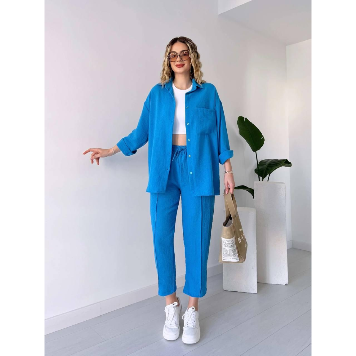 Жіночий літній костюм - чудовий вибір для стильних та комфортних образів у спекотні дні. Він складається з сорочки вільного крою та штанів, створених для легкості та зручності.