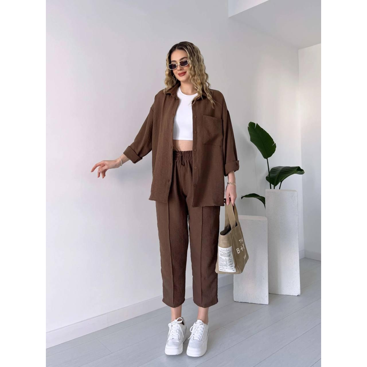 Жіночий літній костюм - чудовий вибір для стильних та комфортних образів у спекотні дні. Він складається з сорочки вільного крою та штанів, створених для легкості та зручності.