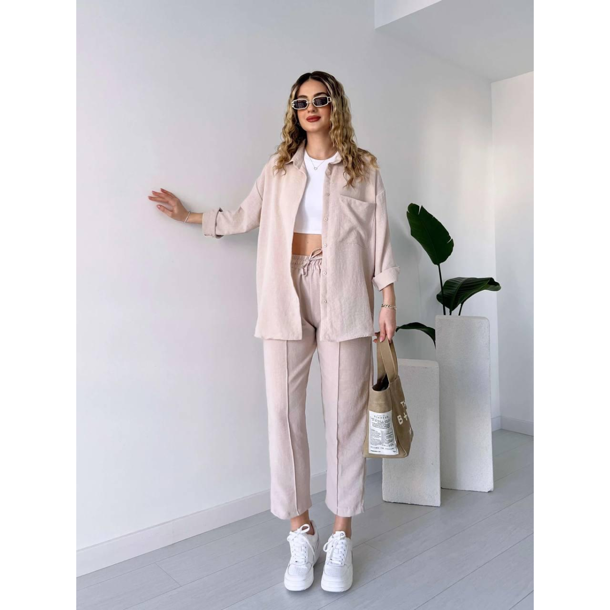 Жіночий літній костюм - чудовий вибір для стильних та комфортних образів у спекотні дні. Він складається з сорочки вільного крою та штанів, створених для легкості та зручності.