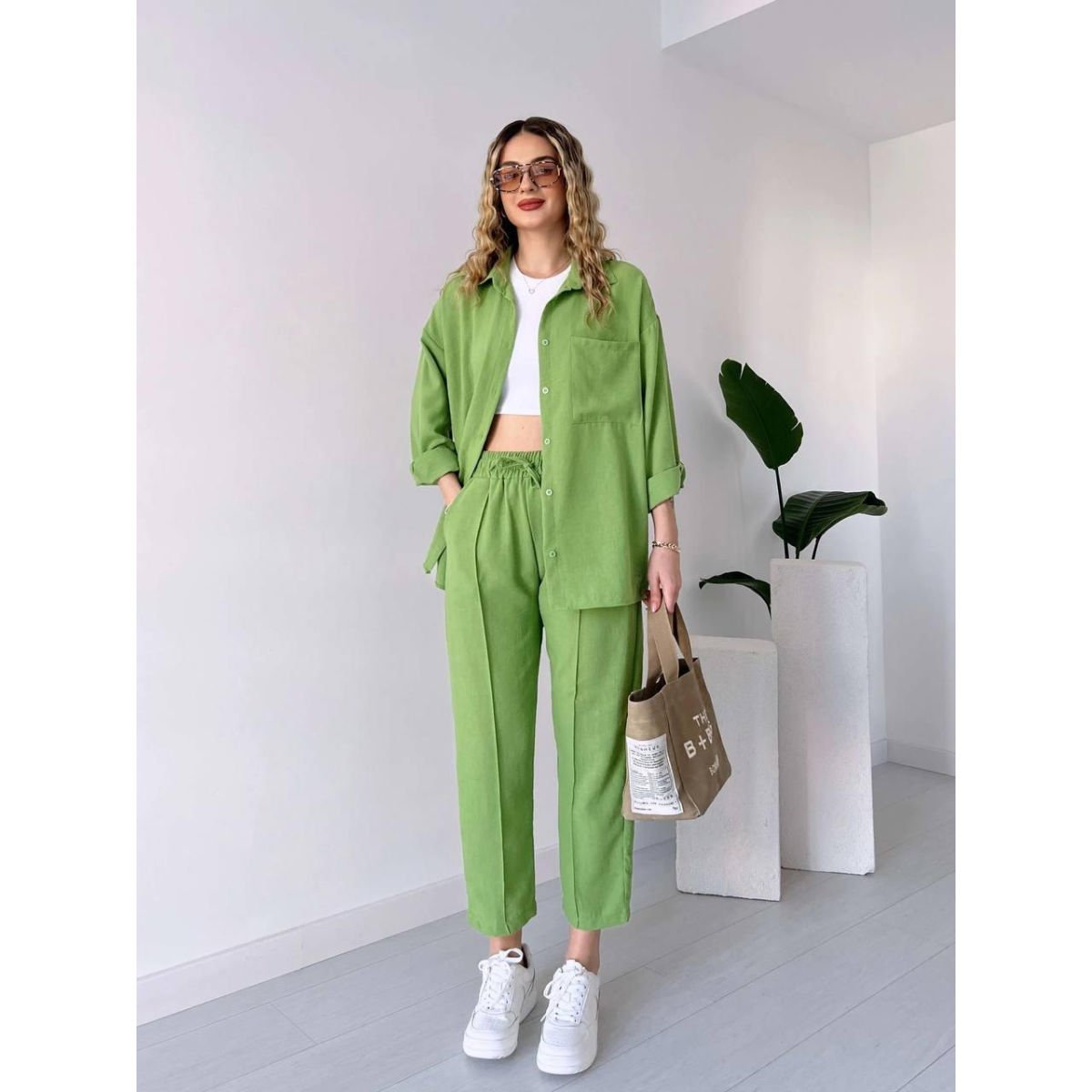 Жіночий літній костюм - чудовий вибір для стильних та комфортних образів у спекотні дні. Він складається з сорочки вільного крою та штанів, створених для легкості та зручності.