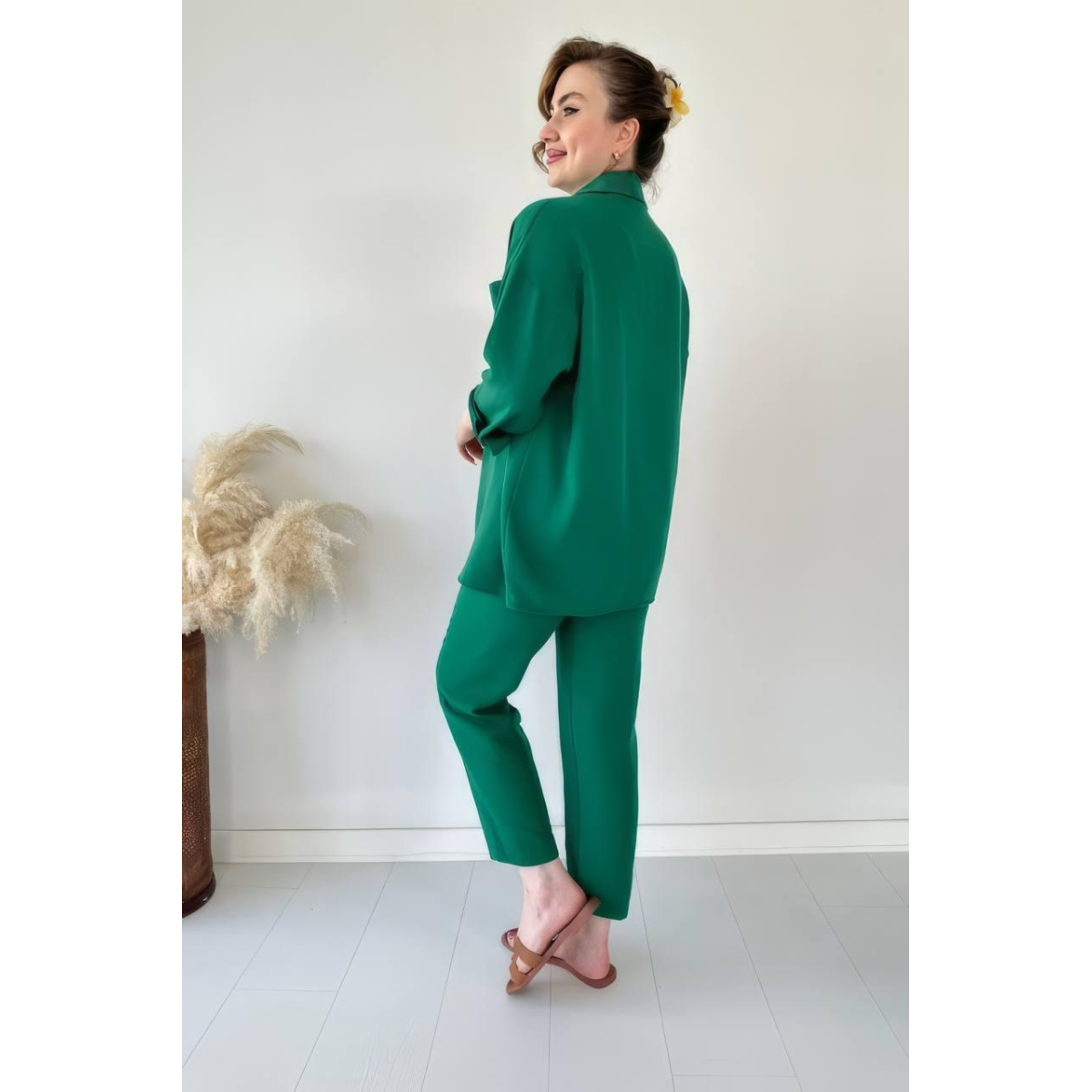 Штани костюма мають кишені та імітацію стрілок, що надає їм елегантний і сучасний вигляд. Вони створюють структурований силует та роблять образ завершеним. Крім того, вони забезпечують зручність завдяки своєму чудовому крою.