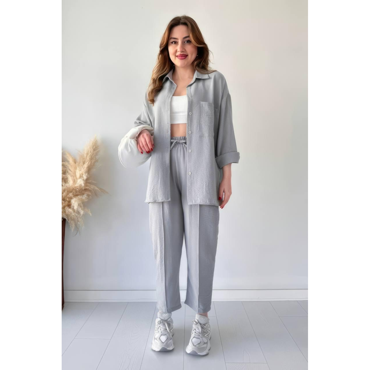 Жіночий літній костюм - чудовий вибір для стильних та комфортних образів у спекотні дні. Він складається з сорочки вільного крою та штанів, створених для легкості та зручності.