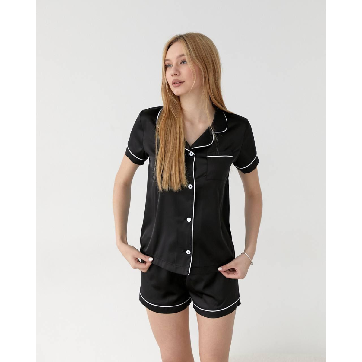 Виберіть комплект із шортів і сорочки на гудзиках із тканини шовк Армані та насолоджуйтесь розкішшю та комфортом щодня.