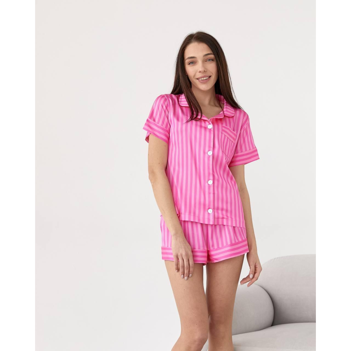Пориньте у світ затишку та розкоші з нашою жіночою піжамою з м“якого сатину, що складається із шортів та сорочки з коротким рукавом. Ця піжама поєднує в собі елегантність, комфорт та стиль, щоб ви могли насолоджуватися кожною хвилиною відпочинку.
