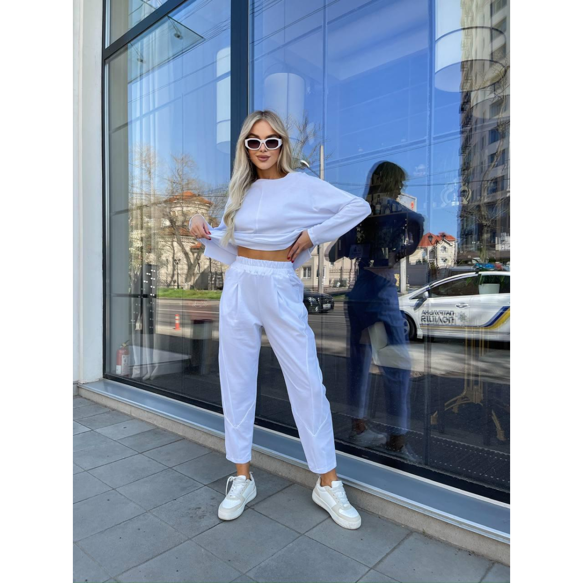 Пориньте в комфорт і стиль з нашим прогулянковим костюмом з тканини лакосту. Цей набір включає світшот з подовженою спинкою і вільні штани-банани середньої посадки зі складним геометричним кроєм.