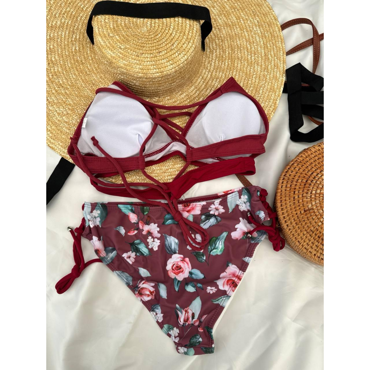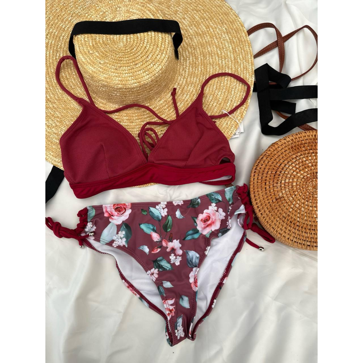 Цей купальник - ідеальний вибір для яскравого та стильного літнього відпочинку на пляжі або біля басейну. Верх із тканини рубчик із регульованою шнурівкою забезпечує комфортну та індивідуальну посадку, а плавки середньої посадки з еластану з квітковим принтом доповнюють образ, створюючи атмосферу літньої свіжості та легкості.