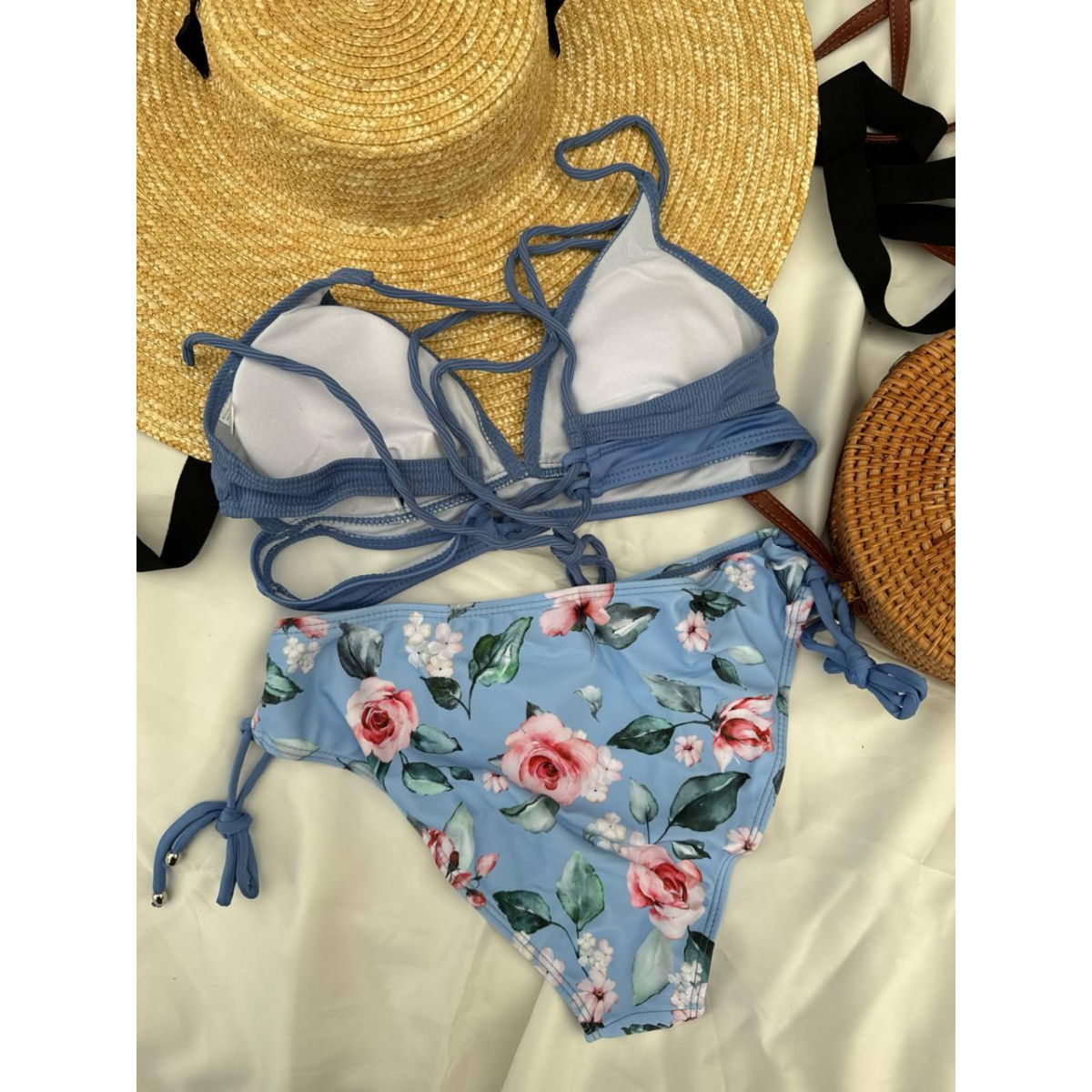 Цей купальник - ідеальний вибір для яскравого та стильного літнього відпочинку на пляжі або біля басейну. Верх із тканини рубчик із регульованою шнурівкою забезпечує комфортну та індивідуальну посадку, а плавки середньої посадки з еластану з квітковим принтом доповнюють образ, створюючи атмосферу літньої свіжості та легкості.