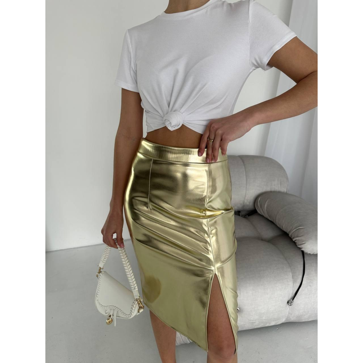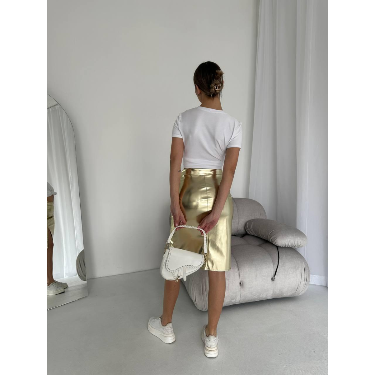 Яскравий і сміливий, металевий відтінок цієї спідниці надає вашому образу сліпучого шику та надзвичайної чарівності.