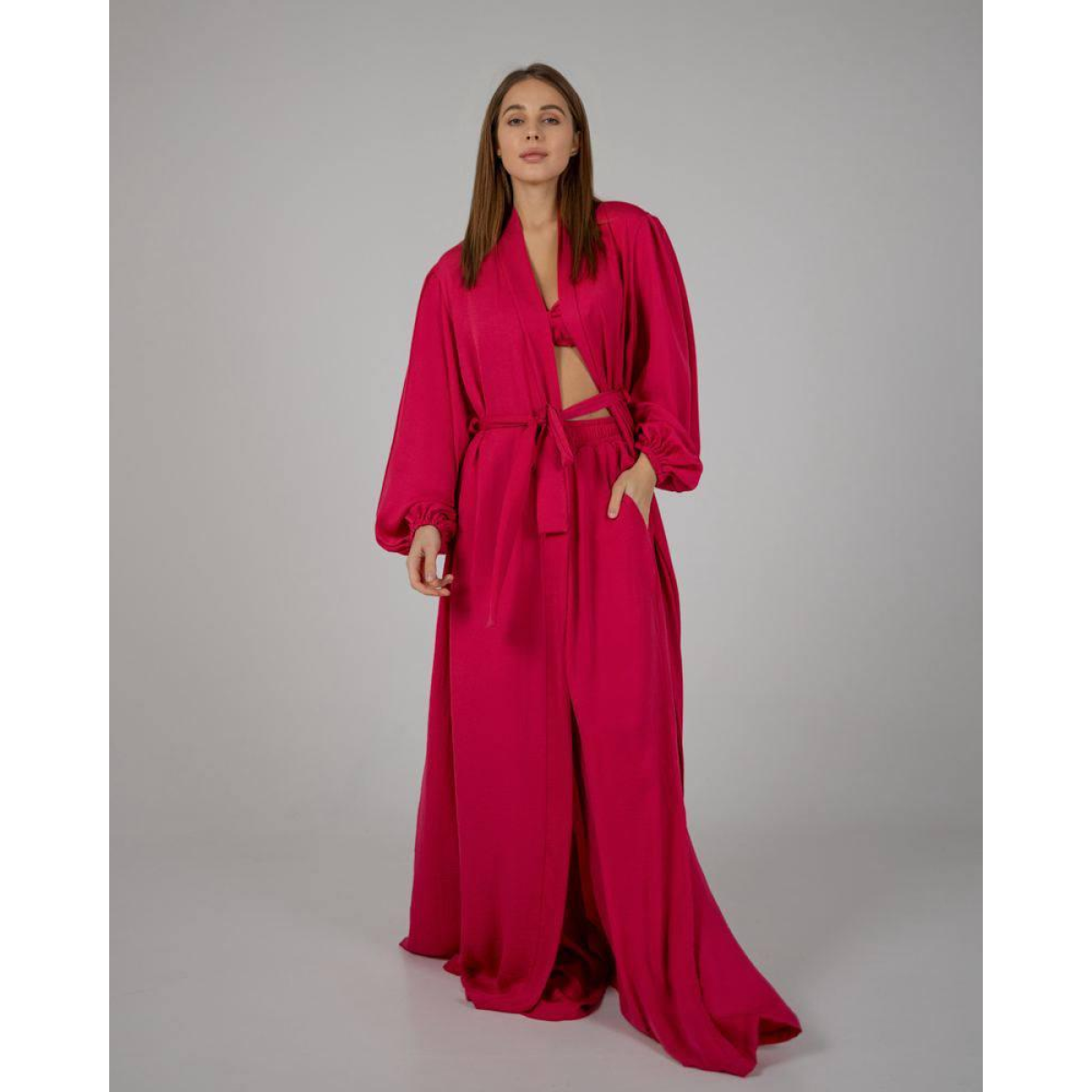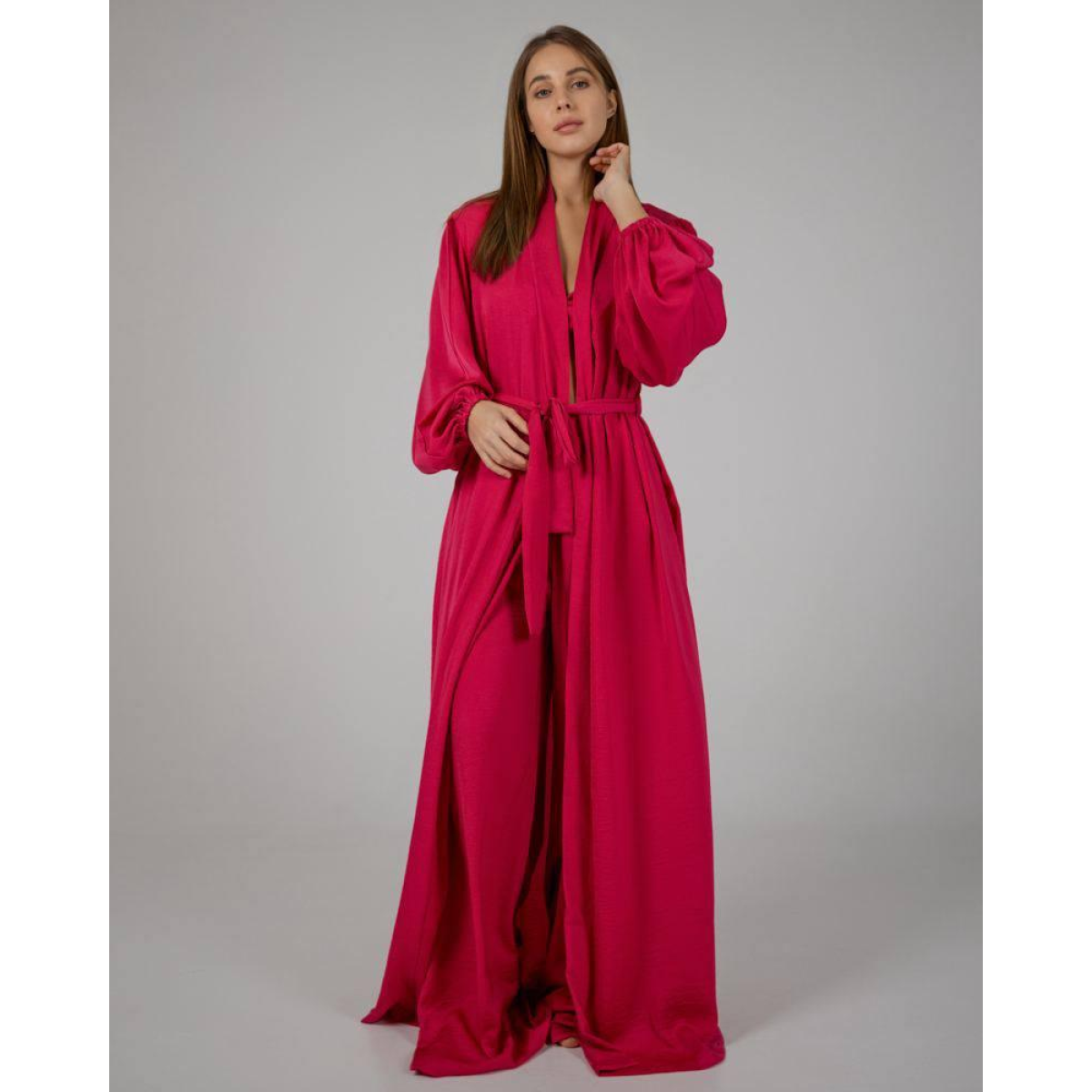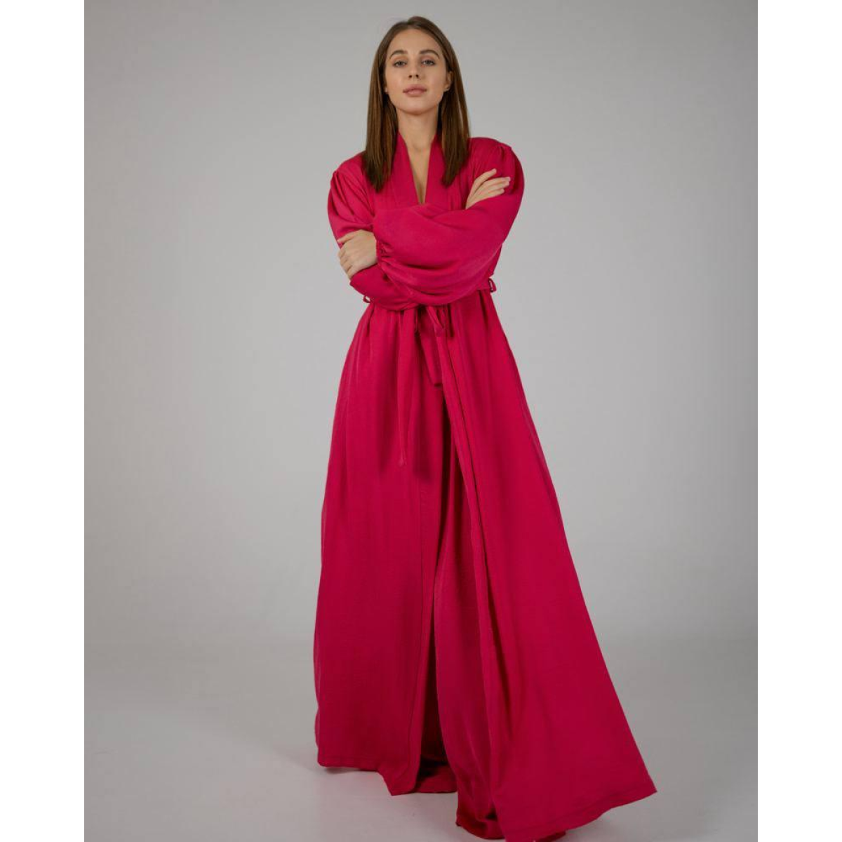 Халат з легким шовковим блиском забезпечує м“яке та приємне відчуття на шкірі. Його широкі манжети і пояс додають вишуканості вашому образу, забезпечуючи максимальний комфорт і свободу руху.