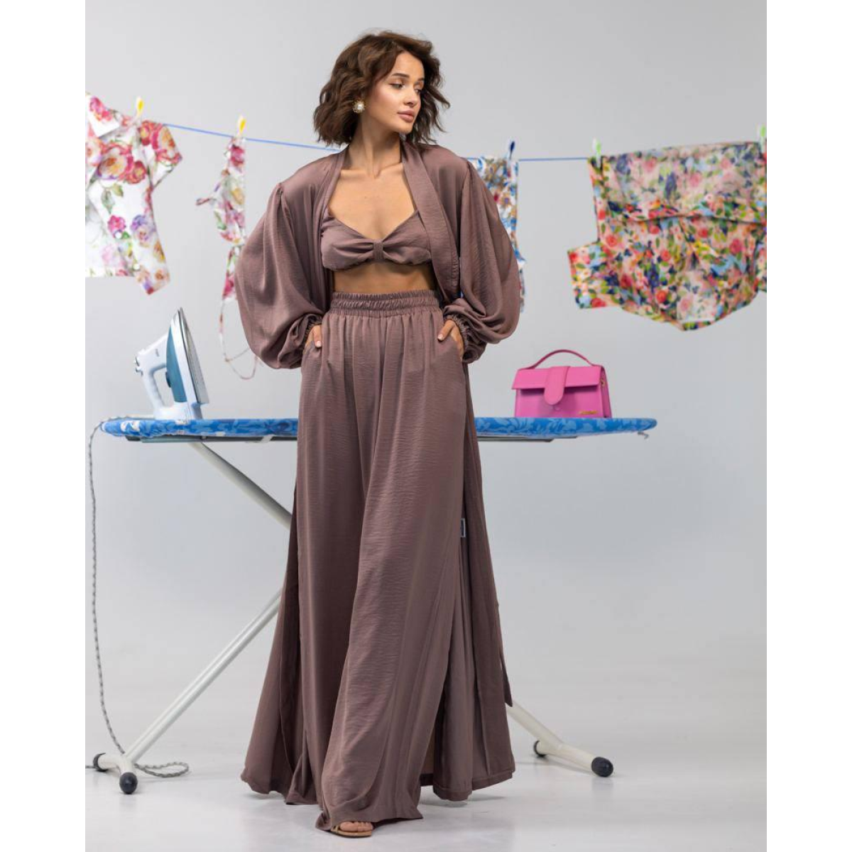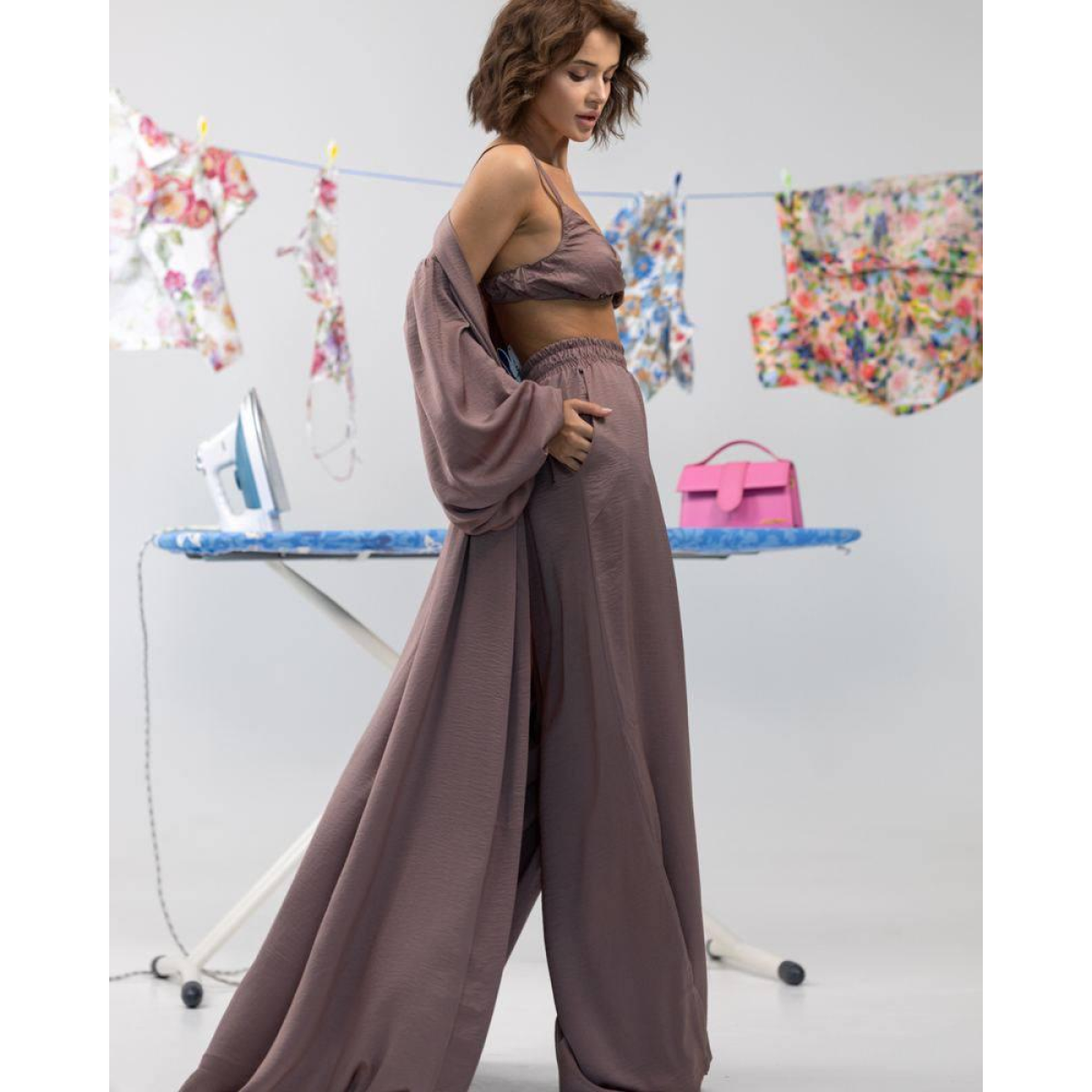Широкі штани завершують образ, забезпечуючи абсолютну свободу руху та комфорт. Їх елегантний крій створює ідеальний баланс між стилем та практичністю, роблячи їх ідеальним вибором для розслаблених моментів затишку.