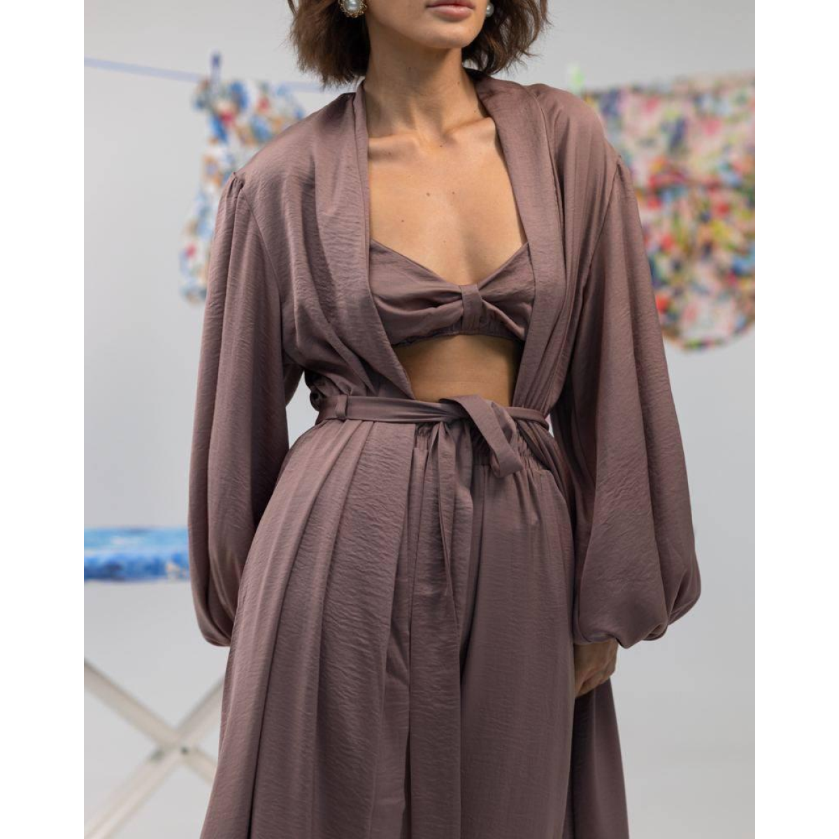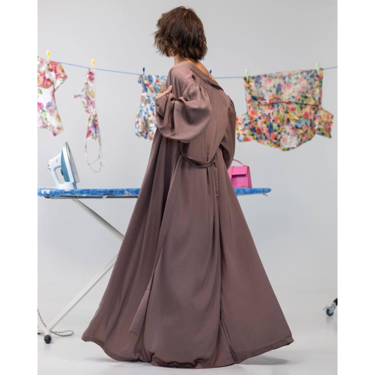 Халат з легким шовковим блиском забезпечує м“яке та приємне відчуття на шкірі. Його широкі манжети і пояс додають вишуканості вашому образу, забезпечуючи максимальний комфорт і свободу руху.