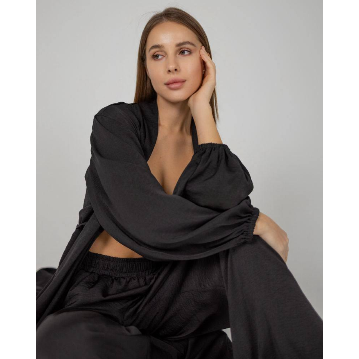 Широкі штани завершують образ, забезпечуючи абсолютну свободу руху та комфорт. Їх елегантний крій створює ідеальний баланс між стилем та практичністю, роблячи їх ідеальним вибором для розслаблених моментів затишку.