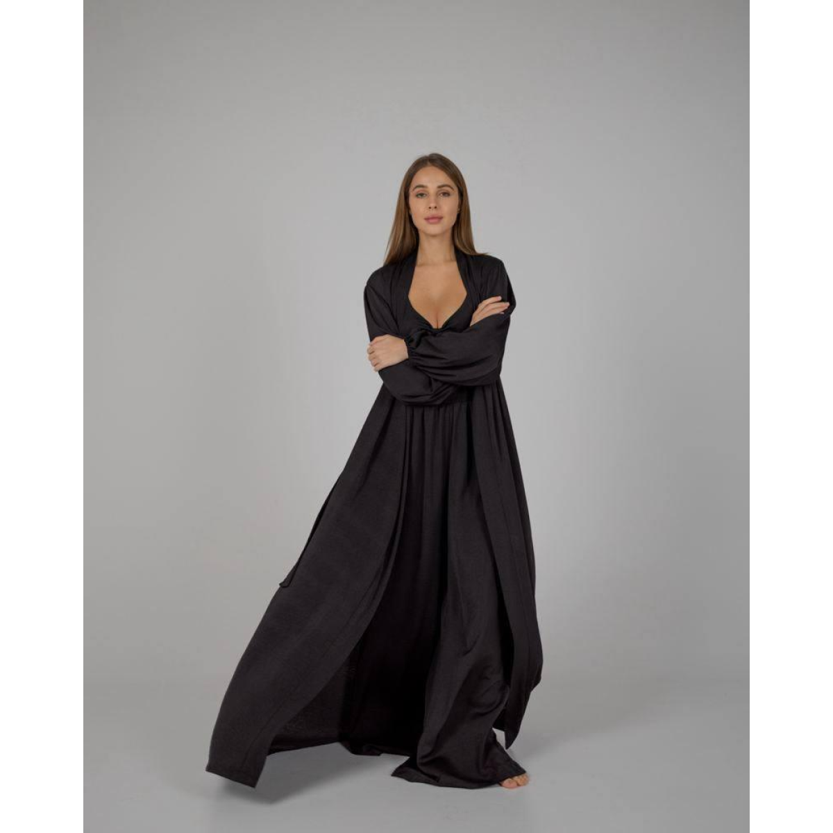 Халат з легким шовковим блиском забезпечує м“яке та приємне відчуття на шкірі. Його широкі манжети і пояс додають вишуканості вашому образу, забезпечуючи максимальний комфорт і свободу руху.
