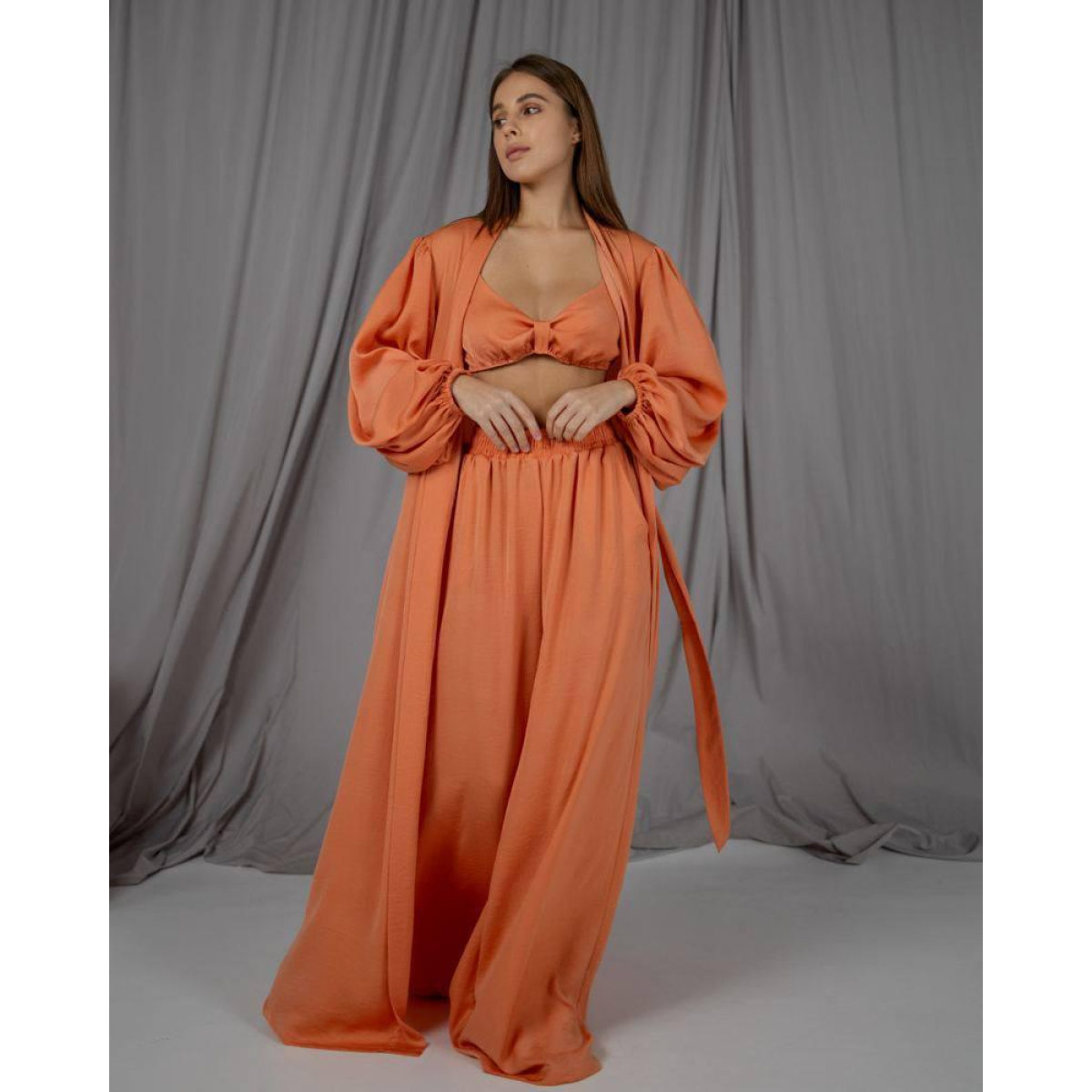 Розмір: S/M довжина халата 141, напівобхват грудей 46, довжина рукава 60, напівобхват халата в районі стегна приблизно 63, Штани: талія гумка 32, тягнеться до 46, напівобхват стегна 59, довжина штанів 113, довжина по внутрішньому шву 78