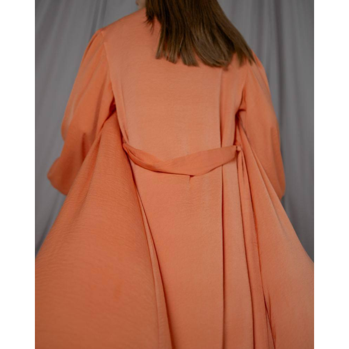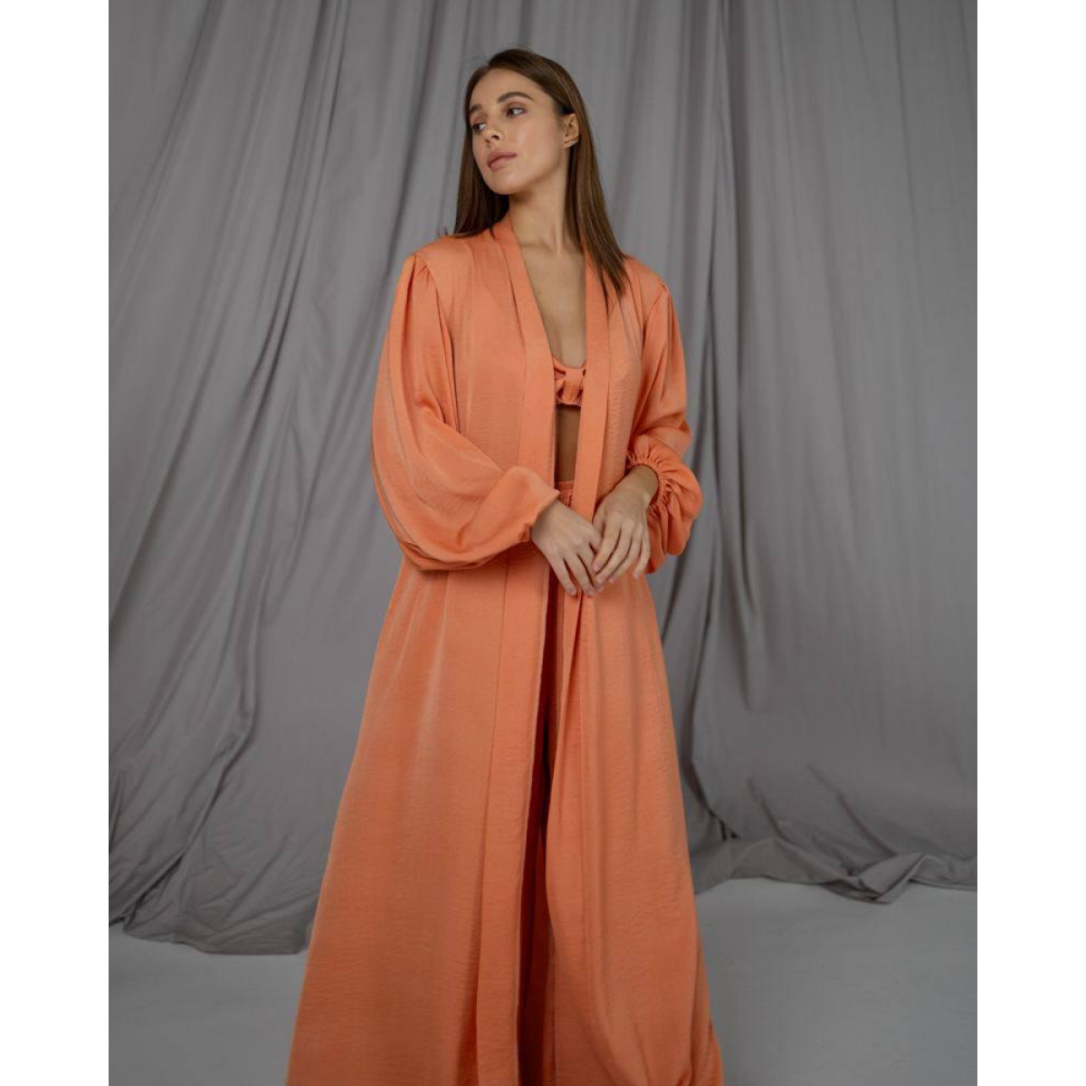 Халат з легким шовковим блиском забезпечує м“яке та приємне відчуття на шкірі. Його широкі манжети і пояс додають вишуканості вашому образу, забезпечуючи максимальний комфорт і свободу руху.