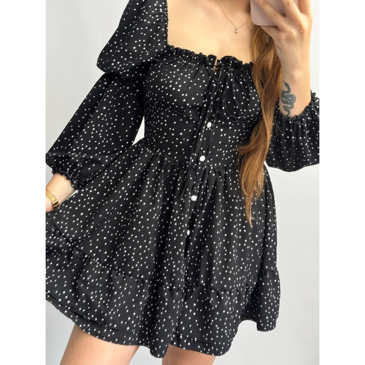 Жіноче софтове плаття на ґудзиках із довгим рукавом. Чорний, Горох, XS-S