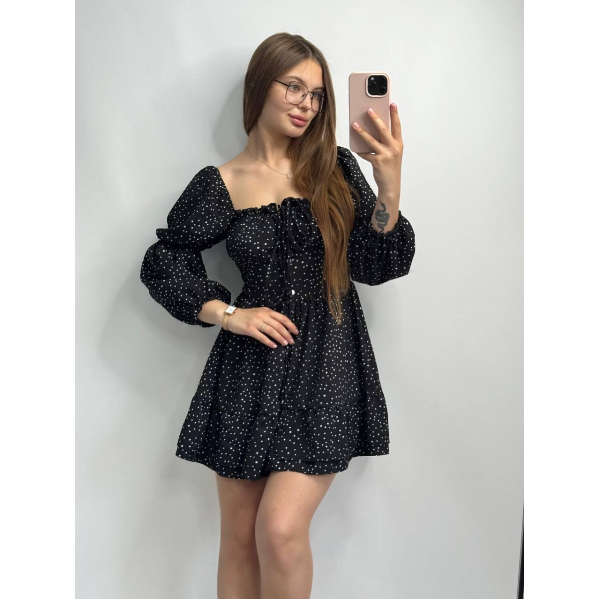 Жіноче софтове плаття на ґудзиках із довгим рукавом. Чорний, Горох, M-L