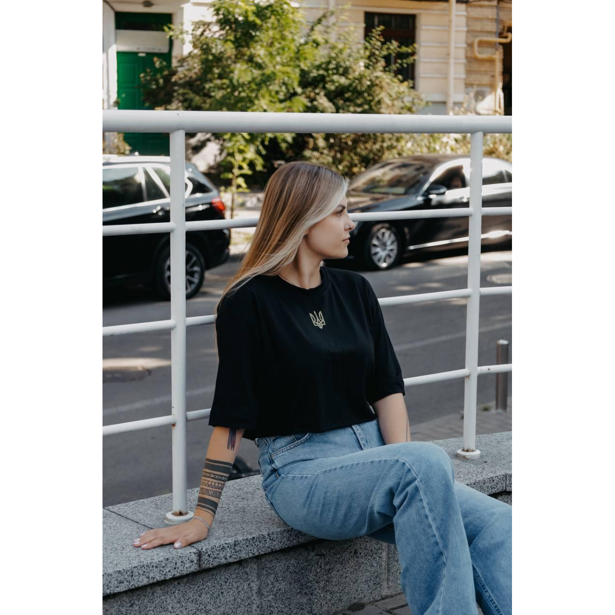 Футболка представлена в класичних кольорах - білому та чорному, що робить її універсальною та легко поєднується з будь-якими елементами гардеробу.