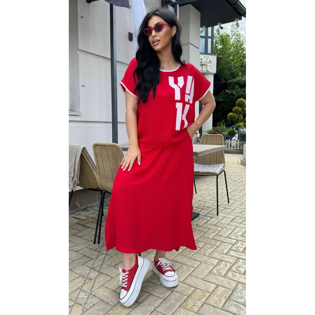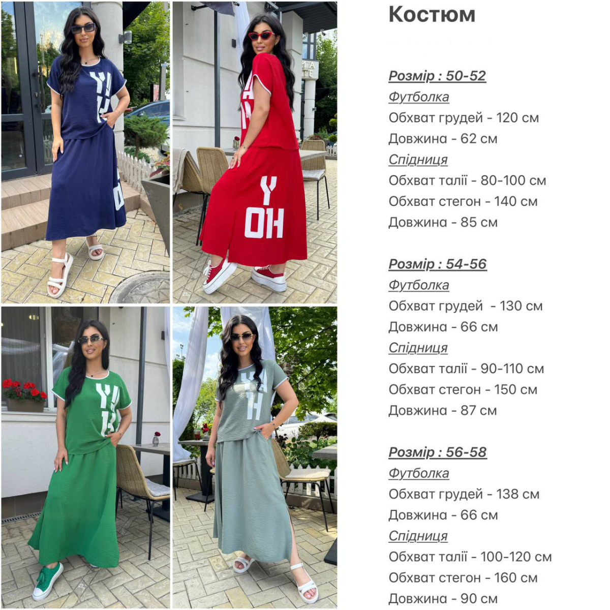 Поповніть свій гардероб стильним і комфортним костюмом зі спідниці та футболки, виконаним з американської креп жатки. Цей костюм поєднує у собі легкість, зручність та яскраві насичені кольори, що робить його ідеальним вибором для теплих літніх днів.
