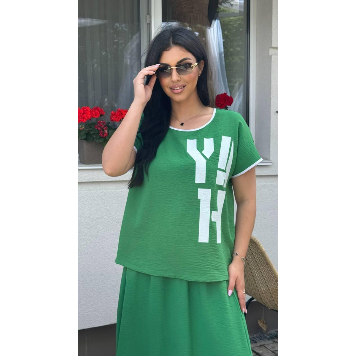 Поповніть свій гардероб стильним і комфортним костюмом зі спідниці та футболки, виконаним з американської креп жатки. Цей костюм поєднує у собі легкість, зручність та яскраві насичені кольори, що робить його ідеальним вибором для теплих літніх днів.