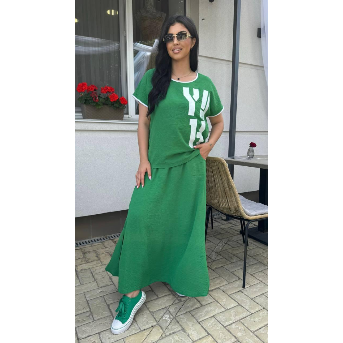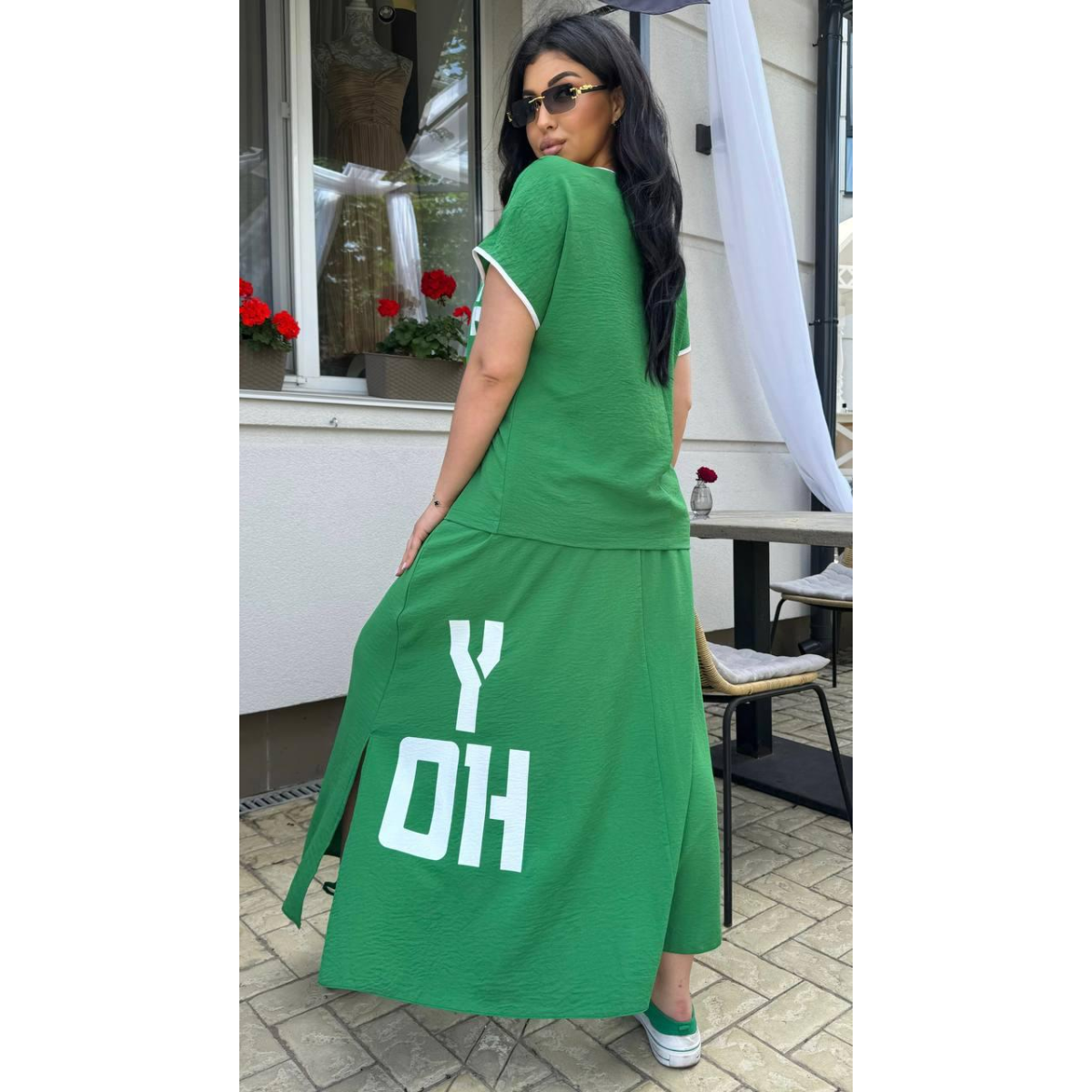 Поповніть свій гардероб стильним і комфортним костюмом зі спідниці та футболки, виконаним з американської креп жатки. Цей костюм поєднує у собі легкість, зручність та яскраві насичені кольори, що робить його ідеальним вибором для теплих літніх днів.