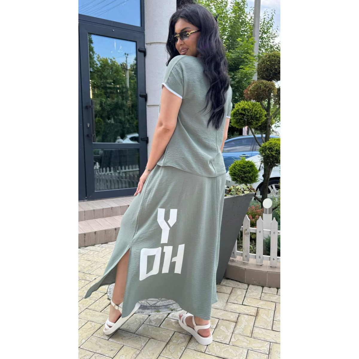 Спідниця оснащена м“якою еластичною гумкою на поясі, що забезпечує комфортну посадку без тиску та дискомфорту. Вона має подовжений крій з розрізами, які додають зручності при ходьбі і надають образу динамічності та елегантності.