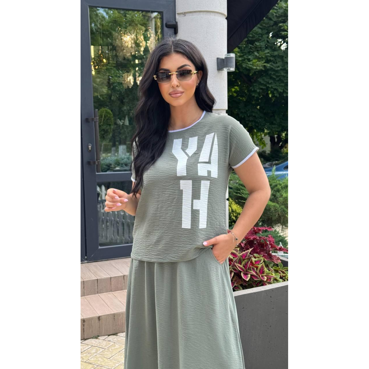 Поповніть свій гардероб стильним і комфортним костюмом зі спідниці та футболки, виконаним з американської креп жатки. Цей костюм поєднує у собі легкість, зручність та яскраві насичені кольори, що робить його ідеальним вибором для теплих літніх днів.