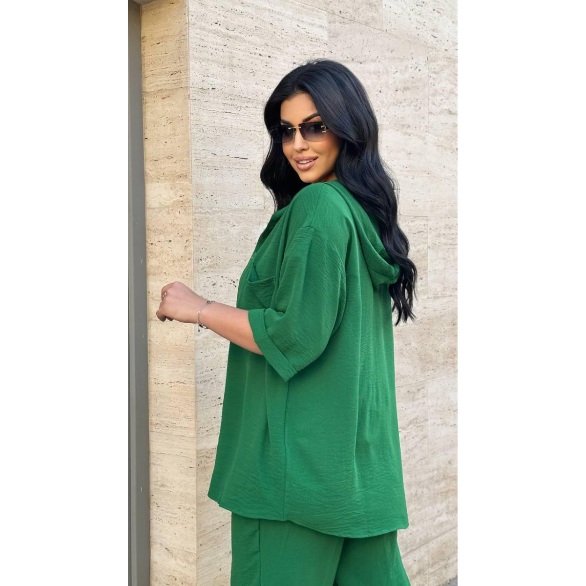Кардиган також виконаний з креп жниварки, що робить його легким і повітропроникним. Кардиган на ґудзиках та капюшоном, що додають йому стиль та універсальність. Рукав довжиною до ліктя забезпечує комфорт та стиль, роблячи кардиган ідеальним для прохолодних літніх вечорів.