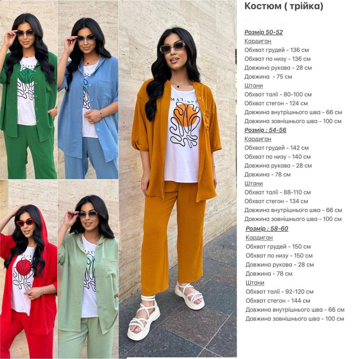 Відкрийте для себе стиль і комфорт з нашим літнім жіночим костюмом, що включає штани та кардиган з креп жниварки і футболку з супер софт. Цей костюм ідеально поєднує в собі елегантність, зручність та яскраві елементи, створюючи гармонійний та модний образ для теплих днів.