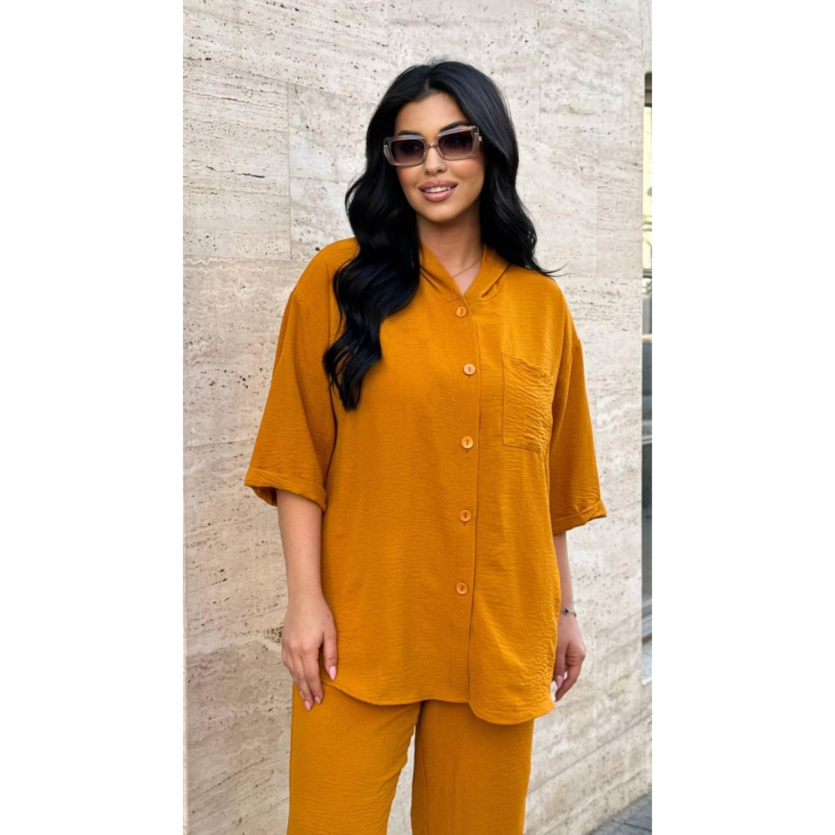 Кардиган також виконаний з креп жниварки, що робить його легким і повітропроникним. Кардиган на ґудзиках та капюшоном, що додають йому стиль та універсальність. Рукав довжиною до ліктя забезпечує комфорт та стиль, роблячи кардиган ідеальним для прохолодних літніх вечорів.