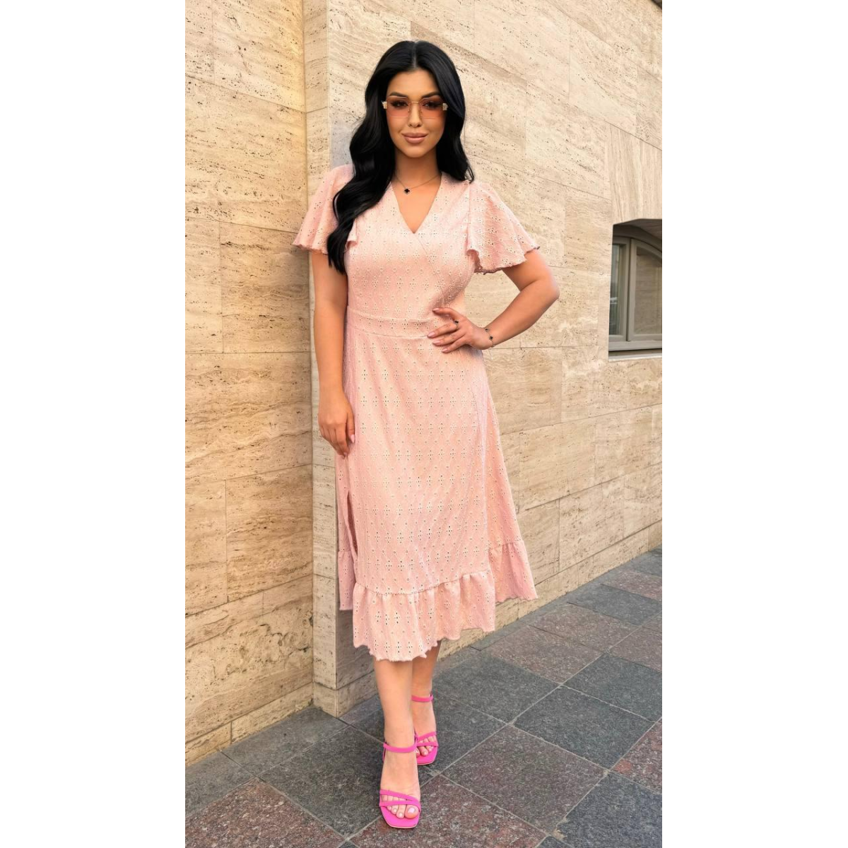 Відкрийте для себе елегантність і комфорт з нашою жіночою сукнею з тканини прошва, довжиною міді. Імітація на запах і короткі рукави додають сукні жіночності та стилю, роблячи її ідеальним вибором для будь-якого випадку.