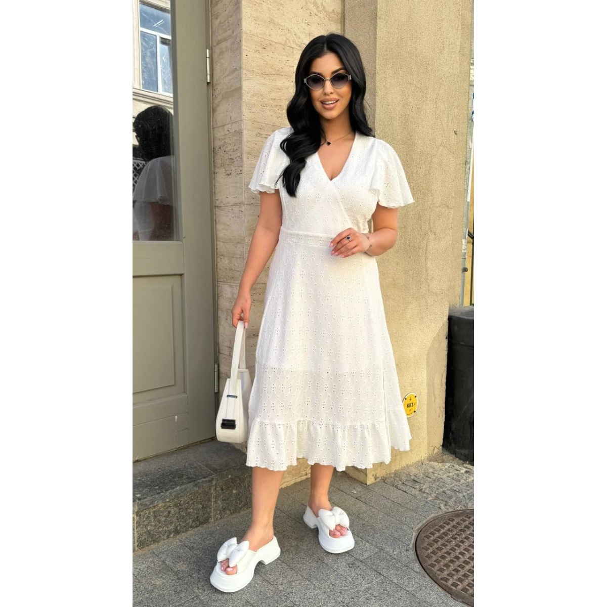 Відкрийте для себе елегантність і комфорт з нашою жіночою сукнею з тканини прошва, довжиною міді. Імітація на запах і короткі рукави додають сукні жіночності та стилю, роблячи її ідеальним вибором для будь-якого випадку.