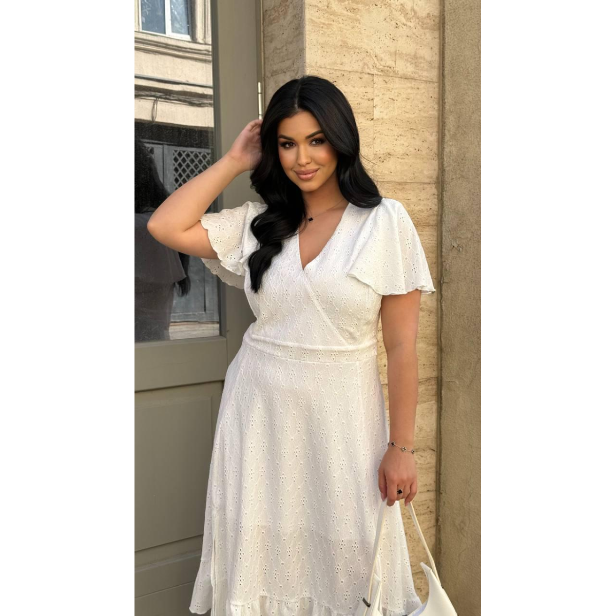Відкрийте для себе елегантність і комфорт з нашою жіночою сукнею з тканини прошва, довжиною міді. Імітація на запах і короткі рукави додають сукні жіночності та стилю, роблячи її ідеальним вибором для будь-якого випадку.