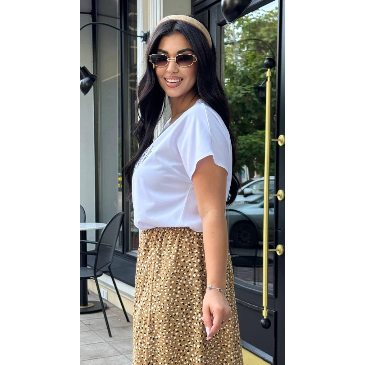 Спідниця з тієї ж тканини софт з додаванням стрейча чудово поєднується з футболкою, створюючи гармонійний і елегантний образ. Легкість тканини та зручний крій забезпечують максимальний комфорт протягом усього дня.