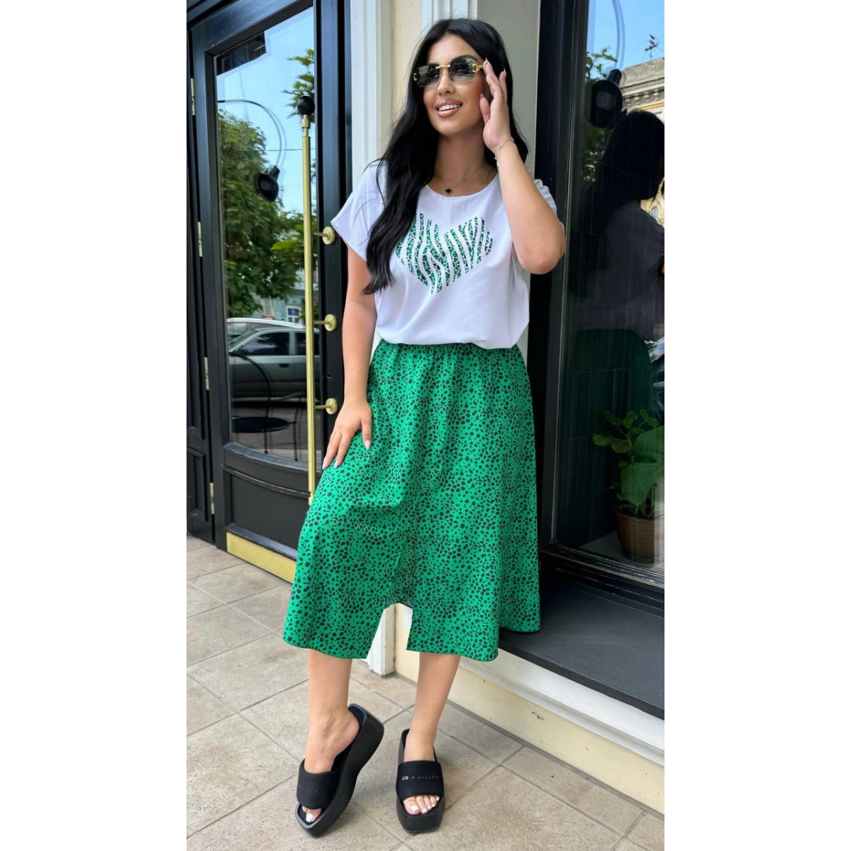 Спідниця з тієї ж тканини софт з додаванням стрейча чудово поєднується з футболкою, створюючи гармонійний і елегантний образ. Легкість тканини та зручний крій забезпечують максимальний комфорт протягом усього дня.