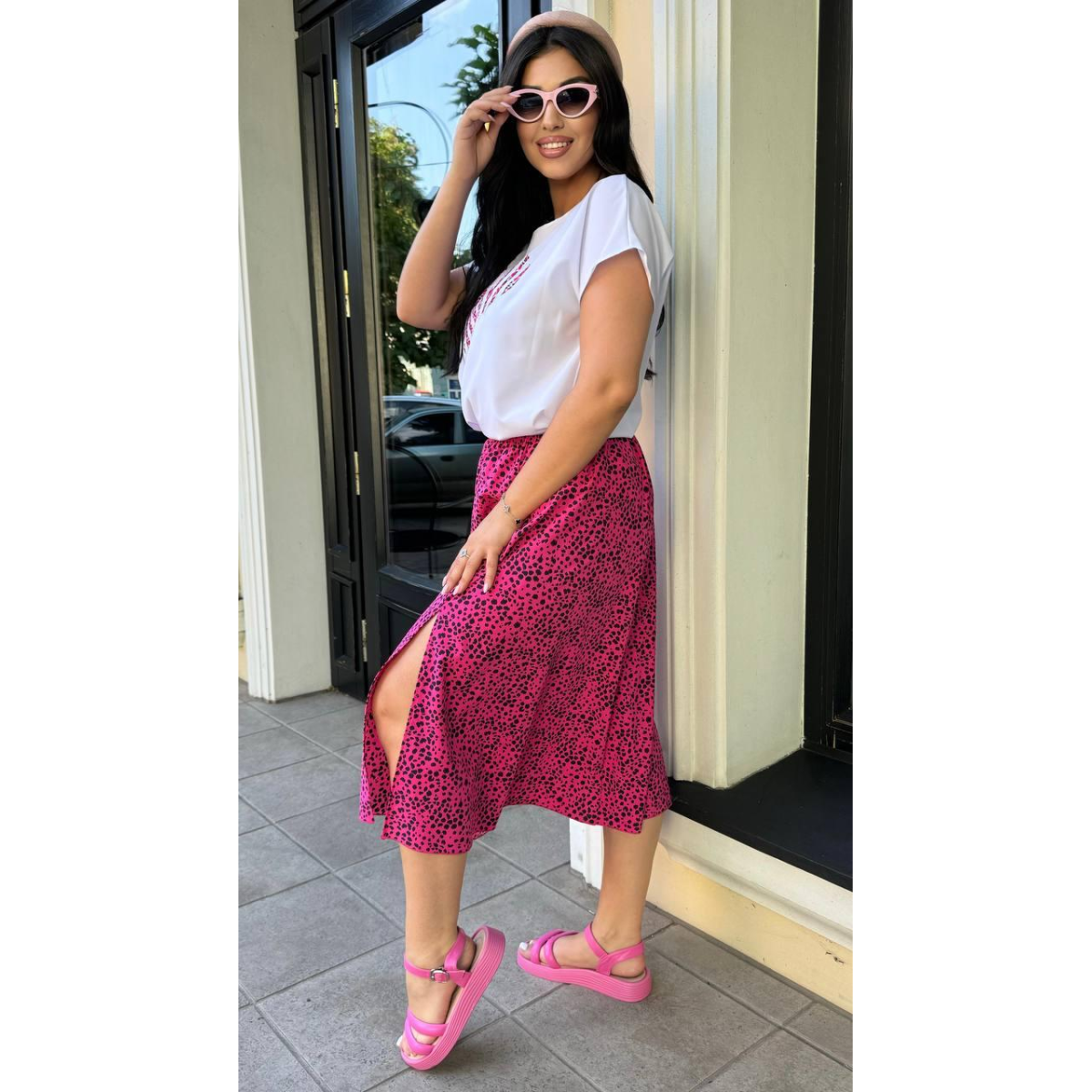 Спідниця з тієї ж тканини софт з додаванням стрейча чудово поєднується з футболкою, створюючи гармонійний і елегантний образ. Легкість тканини та зручний крій забезпечують максимальний комфорт протягом усього дня.