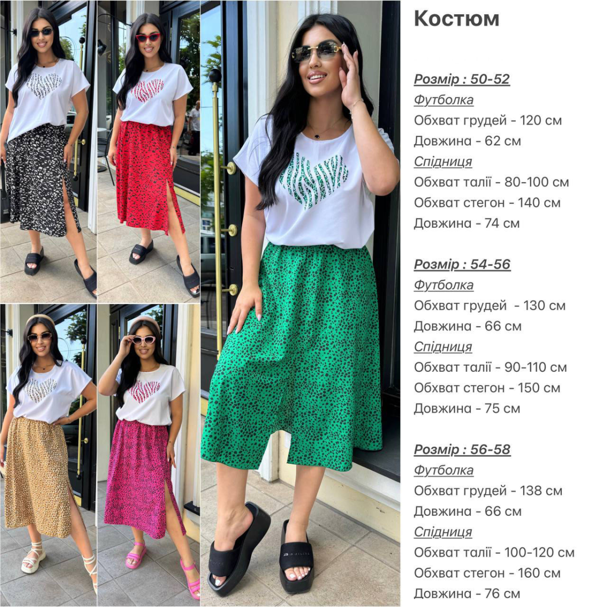 Відчуйте комфорт і стиль у жіночому літньому комплекті, що складається з футболки та спідниці з тканини софт. Цей костюм ідеально підходить для теплих днів, поєднуючи в собі легкість і щільність, щоб забезпечити вам неперевершену зручність і елегантність.