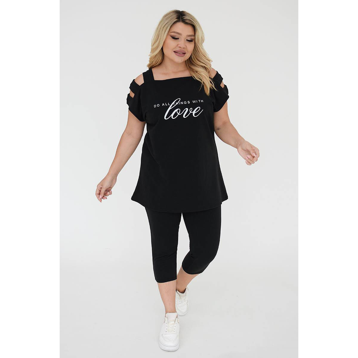 Відчуйте неперевершений комфорт і стиль з нашим жіночим костюмом батал з тканини двунить. Цей комплект, що включає футболку з коротким рукавом і бриджі, створений для тих, хто цінує зручність і елегантність у кожному русі.