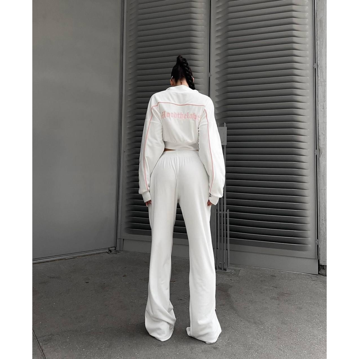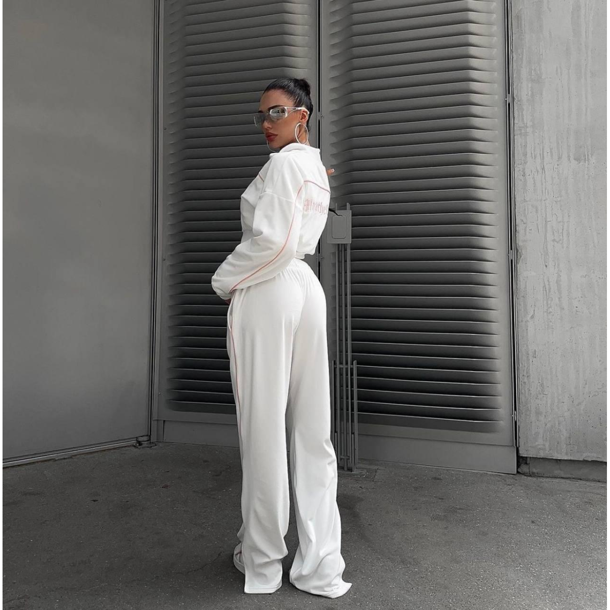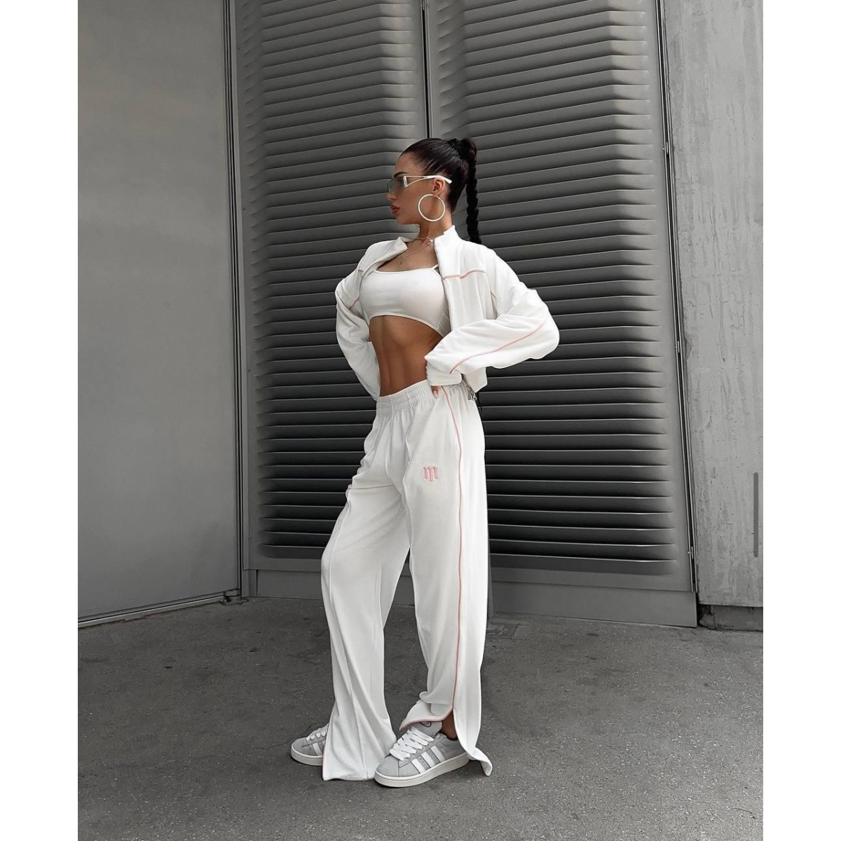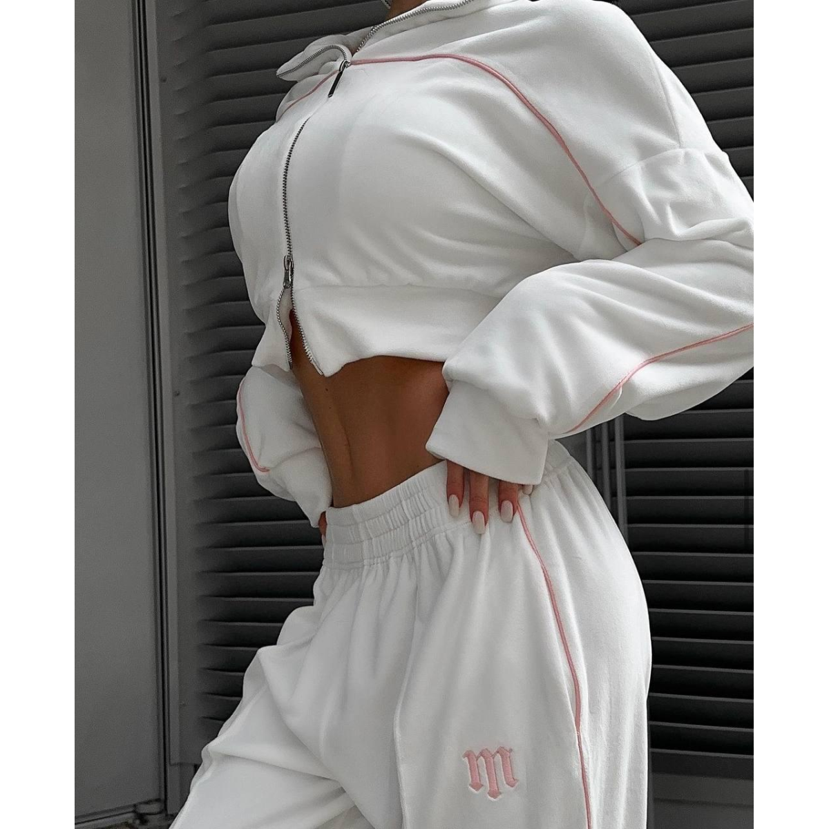 Костюм включає вкорочену кофту, яка акцентує увагу на талії та створює сучасний і стильний силует. Подвійна змійка дає змогу регулювати застібку як зверху, так і знизу, додаючи функціональності та стильності.